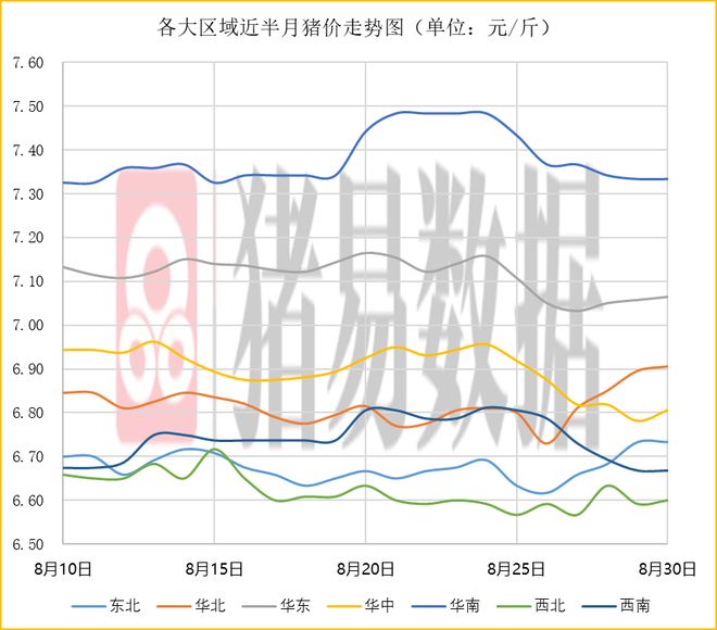 华北、华中、西北地区猪价呈现上涨,东北、华东、华南、西南地区猪价呈现稳定,生猪平均价格呈现微涨。