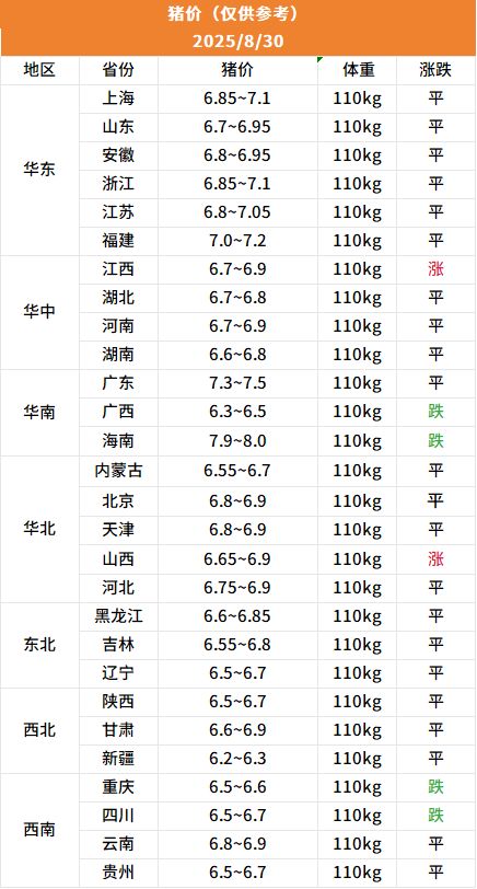 今日全国生猪收购均价呈现上涨态势,标准体重生猪平均价格为6.86元/斤,环比昨日下跌0.01元/斤,上涨地区14个,下跌地区4个,稳定地区10个,全国生猪收购最低价为新疆,价格为6.2元/斤,最高价为海南,价格为8.0元/斤。 月底大场缩量,但今日猪价表现一般,东北、华北地区整体稳定,标猪报价在6块6到6块9,散户基本没动。今日河南一哥出栏价格上涨1毛,广东地区稳定为主,大场缩量拉涨,散户没跟上,另外还有不少中大猪在等价,350斤以上的猪已经亏损,马上进入9月,天气转凉,增重更快,市场出栏压力仍大。关注我带你了解最新的猪价行情。 |