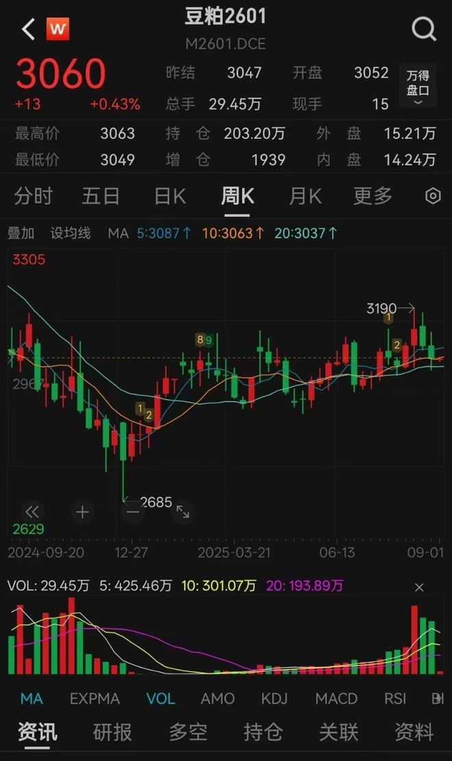 近两周国内豆粕期货价格波动明显,M2601合约从2025年8月中旬3180-3190元/吨,回落至3030-3040元/吨,跌幅近5%。 当前国际大豆市场受主要出口国供需情况影响,美国芝加哥期货交易所(CBOT)大豆价格及巴西大豆对华报价均处于动态调整中。 中州期货有限公司农产品研究总监吴晓杰分析,从国内市场看,目前豆粕现价已低于明年1月大豆到港成本,具备估值修复动力。M2601合约短期或反弹,长期走势仍需关注后续大豆供需格局变化(详情点击视频)。