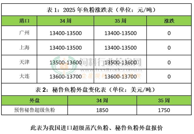 港口鱼粉库存攀升至30万吨以上 由于鱼粉到货继续增加,库存上升。据饲料行业信息网了解得知,截止到2025年8月26日,港口鱼粉库存为30.49万吨,较上周同期增加了0.6万吨,其中黄埔17万吨,上海7.09万吨,天津0.1万吨,大连1.19万吨,其他0.41万吨。 相关数据及最新消息 秘鲁生产部N°00120-2025-PRODUCE号公告,2025年秘鲁A季中北部捕鱼自当地时间2025年7月23日零时正式结束。2025年4月22日-7月20日秘鲁中北部捕鱼量共计2425987吨,剩余配额为574013吨,配额完成80.87%。 2025年下半年南部捕季自7月1日开始,至12月31日结束,配额数量为25.1万吨,2025年7月1-20日南部捕鱼量为9774吨,剩余数量241226吨。 |