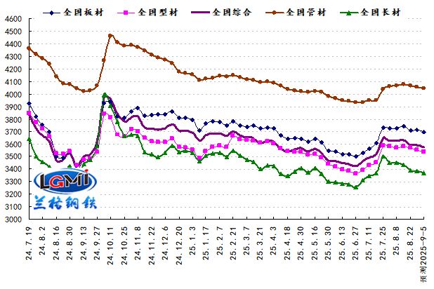 2025年第35周(2025.8.25-8.29)兰格钢铁全国绝对价格指数为3590元,较上周下降0.1%,较去年同期上升1.6%;其中,兰格钢铁长材绝对价格指数为3382元,较上周下降0.1%,较去年同期下降1.2%;兰格钢铁型材绝对价格指数为3553元,较上周下降0.5%,较去年同期上升0.3%;兰格钢铁板材绝对价格指数为3711元,较上周上升0.1%,较去年同期上升4.9%;兰格钢铁管材绝对价格指数为4056元,较上周下降0.3%,较去年同期下降0.5%。 图1 兰格钢铁价格指数变化趋势图