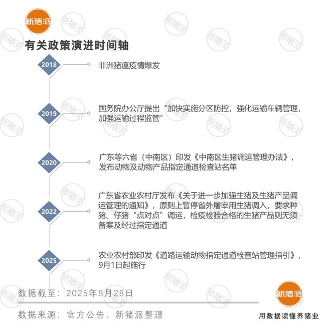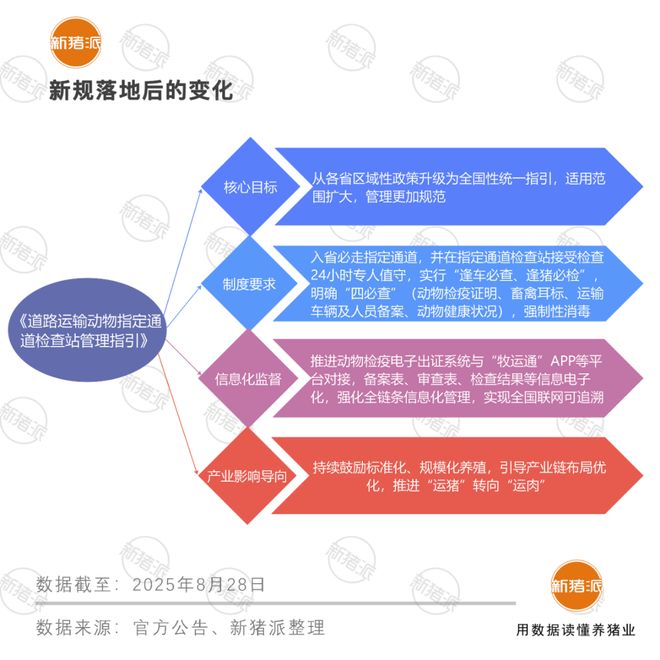 新规的全面落地,将对生猪产业产生深远影响,也对行业的每一个参与者提出了更高的要求,阵痛与挑战在所难免,或推高广东猪价格。据悉,8月31日,广东区三元杂大猪接货价上调为7.60元/斤, 二元杂大猪接货价上调为7.30元/斤。 严格的指定通道制度和查验措施,将有效减少违规调运行为,并且全程电子化管理可追溯,既保证了安全,也提升了效率。但运输车辆需备案、接受检查及消毒,可能导致运输时间延长,生猪也更加容易应激、死亡,增加了短期内的运营成本。 未来可能会促使中小散养户向标准化、规模化的养殖场升级,或从“运猪”转向“运肉”。这场深刻的洗牌,将推动行业走向更规范、更高效、更安全的高质量发展轨道,这是一条必经之路,也是一条通向更强韧产业生态的向上之路。 「 原创文章,未经授权,禁止转载」 【版面编辑】洪琳媛 【数据调研】洪琳媛 【内容采写】洪琳媛 【数据制图】洪琳媛、胡永 【内容审核】李 丹 加入新猪派养猪数据交流群 获取更多数据与资讯 新猪派精选阅读: