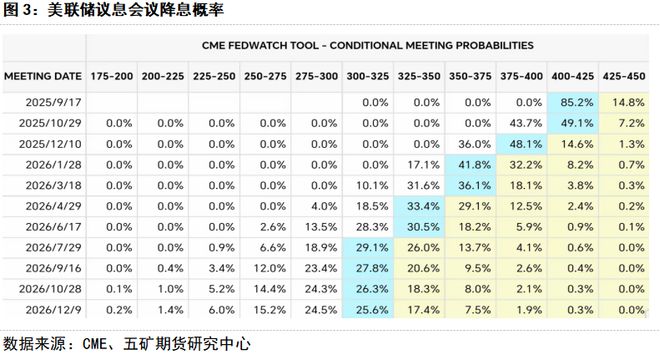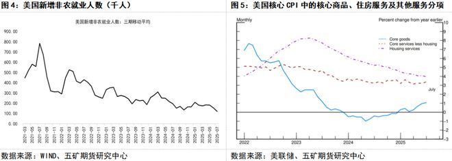 2 美联储主席表态偏鸽引起降息预期提升 8月22日,杰克逊霍尔全球央行年会上,美联储主席演讲中谈及经济形势时称,短期内美国通胀风险偏向上行,但就业风险偏向下行,美联储利率水平仍处于限制区间,基线前景和不断变化的风险平衡需要美联储调整政策立场,总体表态偏鸽。加上美联储面临来自白宫的压力,讲话后,市场加大了美联储在9月份议息会议降息的押注(目前9月降息概率85.2%)。 此次鲍威尔更加强调了劳动力市场的风险。一方面,近几个月美国新增非农就业人数持续放缓,较2024年降幅较大;另一方面,尽管美国失业率仍处于偏低水平(7月份4.2%),其它就业市场指标如职位空缺率等也表现不弱,但他提到失业率偏低的重要原因是劳动力供给与需求同步走软,使得维持低失业率的就业数量更少,失业率数据一定程度上“失真”。事实上美国移民数量的减少导致劳动增长已经显著放缓,这意味着美国的就业下行风险正在上升,而且如果裁员增加,失业率上升的斜率将变大。 通胀方面,尽管美国对主要贸易伙伴实施对等关税,更高的关税已开始推高部分商品的价格,近期美国商品价格的上涨与2024年的温和下降相比转变显著。不过,美国核心CPI中的住房服务通胀仍处于下降趋势,非住房服务通胀也接近2%的通胀目标水平,加之美国利率水平较高,服务通胀进一步上升压力较小。因此鲍威尔认为虽然通胀有一定压力,但持久性通胀抬升的压力很小。 由于当前美国经济仍不弱,如果美联储如预期降息稍前置,那么短期内对主要资产价格和商品情绪都将有所提振。