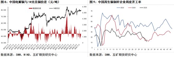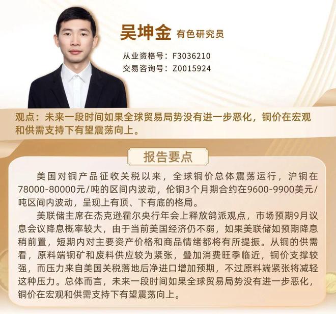 4 总结 美联储主席在杰克逊霍尔央行年会上释放鸽派观点,市场预期9月议息会议降息概率较大,由于当前美国经济仍不弱,如果美联储如预期降息稍前置,短期内对主要资产价格和商品情绪都将有所提振。从铜的供需看,原料端铜矿和废料供应较为紧张,叠加消费旺季临近,铜价支撑较强,而压力来自美国关税落地后净进口增加预期,不过原料端紧张将减轻这种压力。总体而言,未来一段时间如果全球贸易局势没有进一步恶化,铜价在宏观和供需支持下有望震荡向上。 免责声明 本报告信息均来源于公开资料或实地调研,我公司及研究人员对信息的准确性和完整性不作任何保证,本报告中的信息、观点均反映报告初次公开发布时的判断,可能会随时调整;报告中的信息及观点不构成投资要约或买卖建议,投资者据此作出的投资决策及结果与本公司和作者无关。投资有风险,入市需谨慎。 |