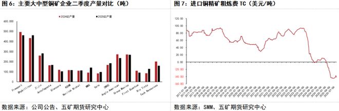 3 供需面利多和利空因素 从铜的供需面看,当前利多因素主要有铜原料供应维持紧张,以及下游传统旺季临近,而利空因素主要为美国铜关税落地后美国以外的铜供应预计增多,电解铜供应趋于过剩。 原料供应方面,二季度全球15家大中型铜矿企业加总产量仅同比小幅增长0.9%,增速延续偏低,自由港、英美资源、泰克资源和第一量子矿业等公司产量均有不同程度的减少。同时嘉能可、泰克资源等公司下调了全年生产指引,全年铜矿供应增速预计偏低(1.5%左右)。近期,全球最大产铜国智利生产情况也有所弱化,6月份由于Escondida等铜矿产量减少,该国产量降幅较大,智利国家铜业公司(Codelco)旗下EI Teniente矿山又因为事故而停产,预计影响3万吨左右产量,使得铜矿供应预期仍紧张。根据SMM统计数据,进口铜精矿粗炼费TC在前期小幅反弹后再次转弱,也突显了矿端的紧张。