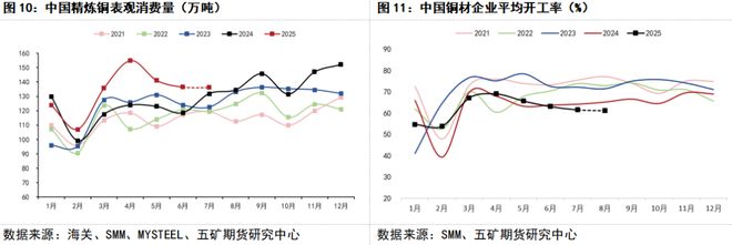下游需求方面,根据SMM调研数据,7月国内铜材企业开工率环比下降且低于去年同期,8月铜材开工率预计延续弱势。虽然国内地产数据依然疲弱,家电排产连续负增长,光伏风电装机在“531”抢装后明显下降,但废铜材替代减少和金九银十临近的背景下,预计铜消费仍有韧性,不会出现明显下滑,从精炼铜表观消费看,7月份其增速明显下降,不过仍维持正增长,8月份表观消费预计延续小幅增长,消费端对铜价仍有支撑。