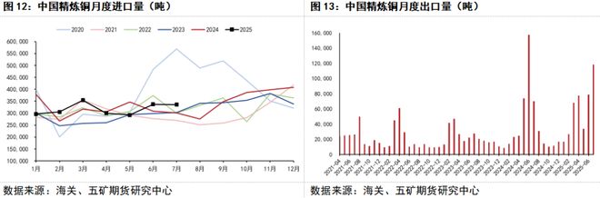 利空方面,年初以来美国铜关税预期引起“抢进口”持续时间较长,美国进口了大量精炼铜,导致美国以外地区供应收紧,其国内铜库存大幅增加。随着8月1日铜关税落地,美国和美国以外的铜价差显著收缩(关税不包含精炼铜),套利窗口关闭,美国精炼铜进口量预计将明显回落,从而为美国以外的地区带来更多铜供应。按照美国4-6月平均20万吨的进口量和美国正常情况下的进口量推算(月均不超过8万吨),关税落地后美国以外的地区每月可增加12万吨左右的供给量,这将扭转关税落地前的短缺状况(实际上美国进口量从7月就已减少),加大供应的压力。对于中国来说,前期因为LME市场供应较为紧张,引起出口数量增多,美国进口增加也造成中国进口减少,当前随着关税落地,中国进口量将增加、出口将减少,净进口增加压力不小。