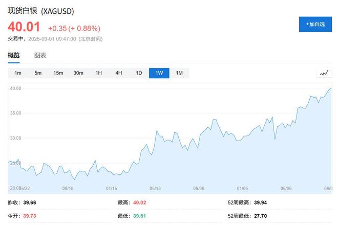 格隆汇9月1日|现货白银涨破40美元/盎司关口,达到2011年以来的最高水平。