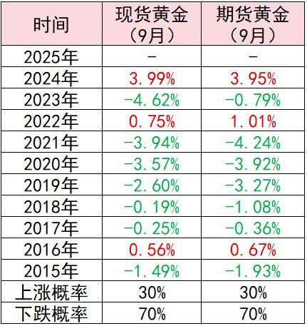 老铺黄金又涨价了。 近期,据多家媒体报道,8月25日老铺黄金京东旗舰店及天猫旗舰店大部分产品已经涨价,1万~3万元左右的热门饰品大约上调了1000~3000元,主要产品涨幅在5%~13%左右。北京SKP门店工作人员表示,这一次多款产品涨价幅度在10%~12%。而今年2月的那一轮提价,涨幅5%~12%。 对于这一价格变化,一些消费者选择在涨价前排队抢购,在多个一线城市的老铺黄金门店均排起了长队,但是抛开品牌溢价带来的金饰涨价因素,仅从黄金投资的角度,考虑保值增值效果,大众又应该如何抉择呢? 过去十年数据显示,九月黄金价格七成概率下跌 黄金价格其实是有季节性波动的,选在最便宜的月份购买黄金,投资胜率自然更大。而黄金价格的变动受多种因素影响,其中包括全球经济状况、政策变动、市场需求等等。 在这些复杂因素中,却也有一些规律可循,比如每年的特定月份,黄金价格下跌的概率明显超过其他月份。根据过去十年数据统计,九月和十一月是全年现货黄金价格下跌概率较高的两个月份,下跌概率分别为70%和80%。 而在9月份,在过去十年之中,无论是现货黄金还是期货黄金(见下表),在9月上涨概率仅30%,下跌概率高达70%,而且我们通过下表注意到,九月的现货黄金除了去年上涨,2022年和2016年也是仅有少许的涨幅,而过去十年有四次跌幅超过百分之二。