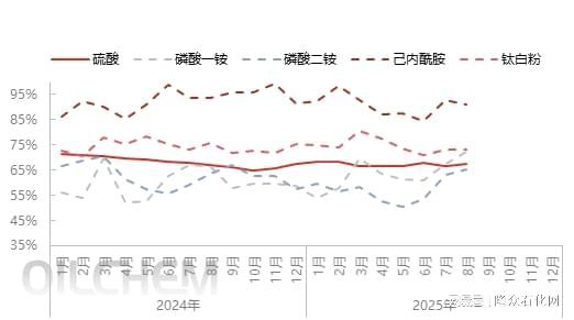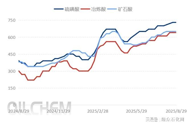 导语:8月国内硫酸市场整体呈现区域分化态势,局部伴随窄幅涨跌,核心驱动因素为各区域供需格局差异及成本端支撑力度不同。 市场概况 数据来源:隆众资讯 8月国内硫酸市场整体呈现区域分化态势,局部伴随窄幅涨跌,核心驱动因素为各区域供需格局差异及成本端支撑力度不同 月上旬:受原料硫铁矿价格高位上行带动,广东云浮地区酸企报价上调30元/吨;华东下游维持刚需采购,酸厂外发顺畅且叠加出口订单支撑,安徽、江苏价格同步走高。供应端,部分酸企检修或短期降负荷导致区域供应趋紧,叠加磷肥季节性刚需拉动,华中多区域及浙江、福建等地酸企纷纷上调报价。山东则因前期减产、停工酸企装置陆续恢复,市场供应增加,而省内需求缺乏利好、北向贸易受阻且胶东出口订单减少,部分酸企为去库存扩大签单优惠商谈空间。 此外,赤峰及东北区域硫酸供需矛盾持续,但当前价格已处高位,下游成本压力凸显,预计下月涨价空间有限。 开工走势