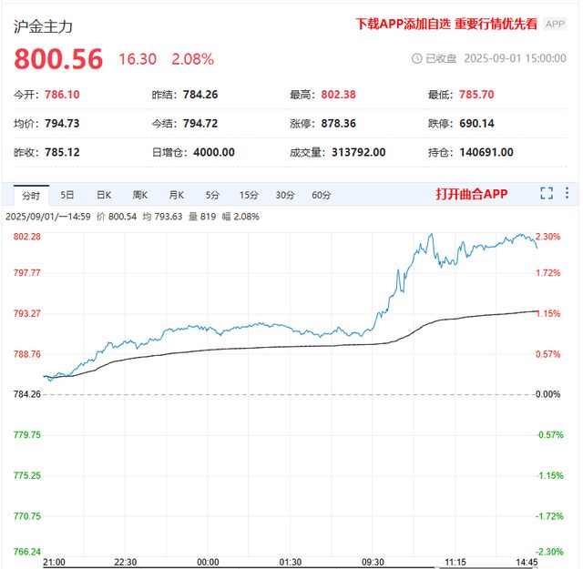 来看华尔街对黄金的看法。 华尔街分析师展现出空前的乐观态度,14位参与者中86%预计下周金价将继续上涨,无一人看跌,剩余14%认为将横盘整理。 散户投资者的在线民意调查结果显示,179票中68%看好上涨,17%预测下跌,16%预期整固。 目前对于接下来黄金的上涨普遍偏乐观,黄金价格日内出现上涨。 沪金收盘上涨2.08%,报收800.56元/克,再次打破800大关。