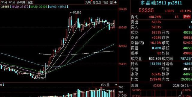 协鑫科技兰天石:未来多晶硅价格大概率在6万—8万元/吨 广期所多晶硅主力合约涨幅扩大超6%,现报52335元/吨。