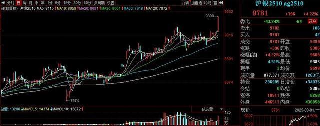 据了解,受近期多晶硅行业自律以及市场交易影响,国内头部多晶硅企业报价上调,其中棒状硅主流报价上涨至55元/千克,颗粒硅报价49元/千克。对于后续成交情况需继续观察。(SMM) 8月31日,协鑫科技联席CEO兰天石在回答投资者关于硅料价格走势问题时表示:“未来多晶硅价格随着开工率的变化,可能会有小幅上升,在6万—8万元/吨的概率较大。” 目前硅料全行业仍有35万—40万吨库存待消化,产能规模依旧远高于下游需求。尽管近两个月价格回升带动全行业开工率进一步提高,但市场普遍关心:价格上涨是否会拖累产能出清进程? 对此,兰天石认为,即便未来2年至3年内多晶硅的价格升至5万—6万元/吨,也不会有企业新建产能。未来行业竞争的核心将主要集中在“提升硅料品质”与“降低生产成本”两方面。 杨文忠进一步介绍,针对已有硅料产能的收储方案,目前业内尚没有定论。公司将在保证现金流的情况下,择时进行回购操作。 国投期货指出,多晶硅周度库存数据下降较快,下游成交放量,主因行业自律约束,9月多晶硅排产下滑预期较强。本周不排除“反内卷”政策预期再次发酵,但更多细节披露出来前,维持震荡判断。 受避险情绪和宽松预期支撑 贵金属涨势延续 上期所沪银主力合约涨超4%,现报9781元/千克,刷新上市以来新高。上期所沪金主力合约涨超2%,现报801.82元/克。