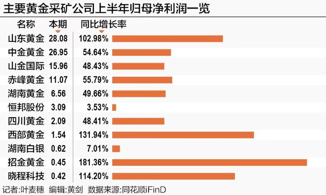 上半年,山东黄金营收和净利冠绝行业。2025年半年报显示,2025年上半年,其实现营业收入567.66亿元,同比增加109.92亿元,增幅24.01%;实现利润总额54.83亿元,同比增加26.75亿元,增幅95.23%;归属于上市公司股东的净利润28.08亿元,同比增加14.25亿元,增幅102.98%;加权平均净资产收益率9.81%,同比增加4.80个百分点;基本每股收益0.57元,较上年同期的0.26元增加0.31元。 山东黄金表示,其高增长受益于黄金价格上涨及成本控制优化。与此同时,其自产金、外购金销售量在上半年双双提升。财报数据显示,2025年上半年,山东黄金矿产金产量24.71吨,占国内矿山企业矿产金产量的17.72%,自产金销量23.60吨;而其海外矿山产金5.67吨。山东黄金表示,预计2025年其年产黄金1吨以上的矿山将达到13座。 而在营收规模50亿元以上的金矿上市公司中,西部黄金盈利增速最快。中报显示,其上半年营业总收入为50.30亿元,较去年同报告期增加20.54亿元,实现3年连续上涨,同比较去年同期上涨69.01%;归母净利润为1.54亿元,较去年同报告期归母净利润增加8735.59万元,实现2年连续上涨,同比较去年同期上涨131.94%。 取得如此增速,得益于西部黄金自有矿山生产黄金销量大增,且金价上升。上半年,西部黄金自产黄金达5.90吨,比去年同期多生产了1.36吨。同时,这家公司还收购了新疆美盛100%股权,并投产其120万吨/年采选项目,预计下半年全面达产后可新增年产金金属约3.3吨。 此外,中金黄金、湖南黄金、山金国际、赤峰黄金、西部黄金、四川黄金、招金黄金等多家涉及金矿的上市企业2025年上半年营收和利润也实现同比增长。根据同花顺统计,目前A股11家金矿上市公司,今年上半年的归母净利润增速全部实现正增长,其中有4家更是实现了翻倍。 对于上半年业绩高增长,多家金矿上市公司都把关键原因归为金价持续上涨和黄金饰品消费偏好转移,与此同时,多家企业在上半年通过收购、扩产等,产量得到提升。 业绩向好,黄金板块在资本市场上也表现出色。多家黄金概念股股价创下阶段性新高,比如晓程科技9月1日大涨13.43%,中金黄金、湖南黄金、西部黄金全部涨停。 |
