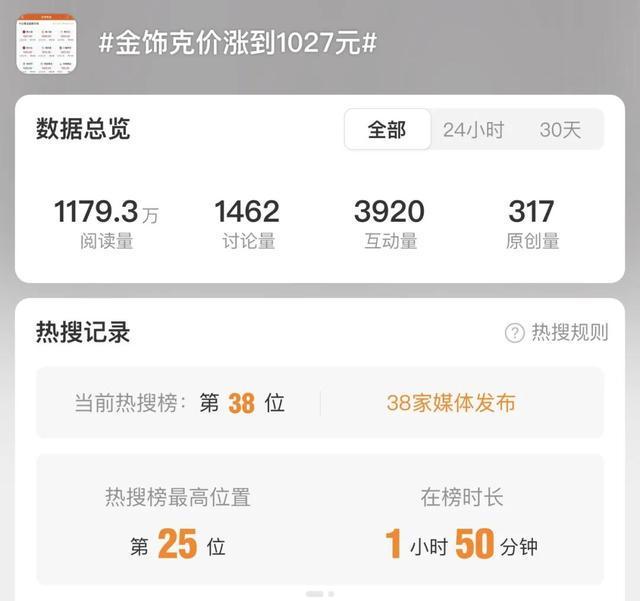 9月1日 话题“金饰克价涨到1027元” 登上热搜,引发关注