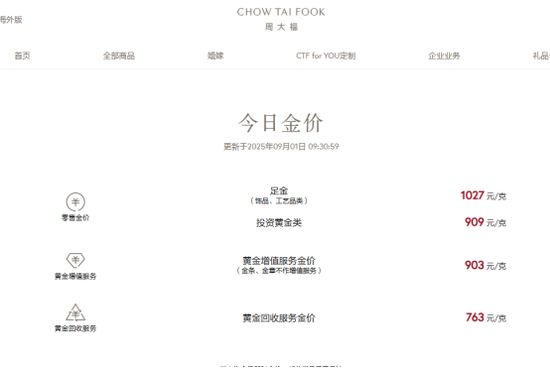 来源:证券时报网 金价再度大涨。 今日(9月1日),COMEX黄金价格盘中最高涨至每盎司3557.1美元,突破了8月初创下的每盎司3534.1美元的历史高点;现货黄金逼近今年4月创下的每盎司3500美元历史纪录。受此影响,A股黄金股全线飙涨,国内多家品牌金饰价格再度超过1000元/克,深圳水贝市场的金饰克价也再度突破800元。 记者查询各大金饰品牌公布的数据看到,周大福足金(饰品、工艺品类)价格为每克1027元,潮宏基足金饰品价格也为每克1027元,每克均较前一日上涨12元。