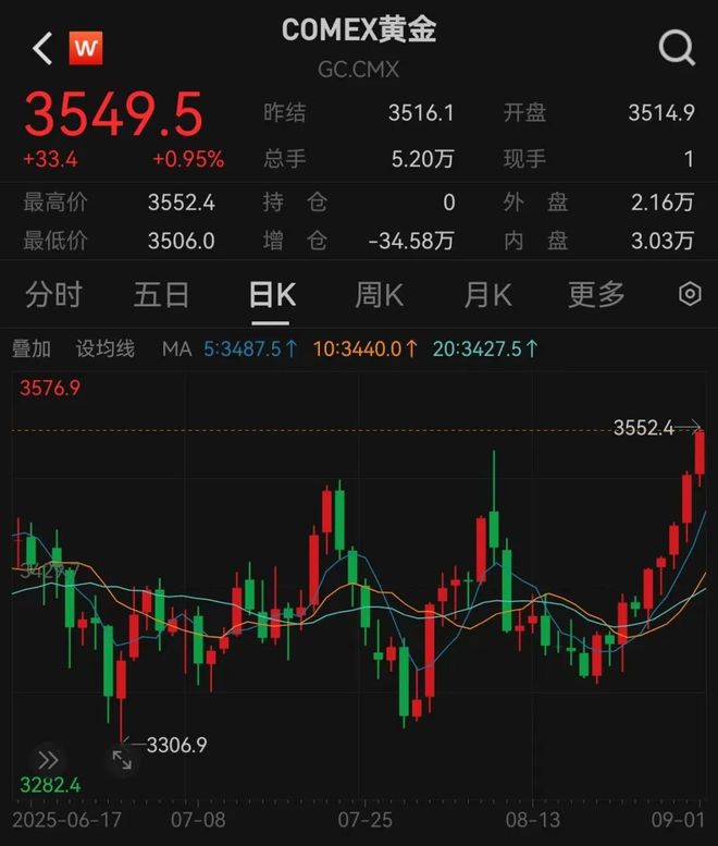 高位震荡近半年后,近期国际金价重拾升势。受访公募机构及人士普遍认为,黄金在消化了前期美国经济数据反弹和关税冲突缓和带来的利空后,近期开始重新受降息驱动进入上行行情。展望后市,黄金具备进一步上行的空间,但需警惕市场提前交易降息预期。 金价创历史新高 黄金股全线飙涨 9月第一个交易日,COMEX黄金价格盘中最高冲抵3552.4美元/盎司,突破了8月初创下的3534.1美元/盎司的历史高点。 受国际金价上涨提振,A股贵金属板块大幅领涨。Wind数据显示,截至收盘,中金黄金、湖南黄金、湖南白银、西部黄金涨停,晓程科技涨超13%,赤峰黄金涨超8%,山东黄金、招金黄金涨超7%。