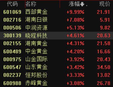 ☝ ☝ 点 一 下 关 注 我 们 ☝ ☝ 生活在金华 就爱「最金华」 来源作者:证券时报、深圳商报、第一财经 版权归原作者所有,如有侵权请及时联系 9月1日,国际现货黄金高开,一度向上触及3450美元/盎司。 10:08现货黄金站上3470美元/盎司,为4月以来新高。 今天上午,黄金板块走强。 西部黄金涨停,湖南白银、中金黄金、招金黄金、湖南黄金、晓程科技、山金国际等跟涨。