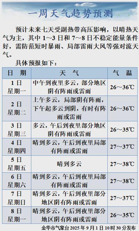 金华短期天气 预计今天中午到夜里多云,部分地区阴有阵雨或雷雨 明天上午多云,局部阴有阵雨,下午起多云到阴,有时有阵雨或雷雨 后天多云,午后到夜里部分地区阴有阵雨或雷雨 以上有雷雨地区可伴有强雷电、短时暴雨、局地7~9级雷雨大风和小冰雹等强对流天气。 风力方面 今日 偏东风2~3级 气温方面 明天早晨最低温度24~26℃ 明天白天最高温度34~36℃ 金华天气展望 根据最新气象资料分析 预计未来七天受副热带高压影响 以晴热天气为主 其中2~3日和7~8日不稳定能量条件好 需防范短时暴雨、局部雷雨大风等强对流天气 请大家密切关注最新的天气预报和预警信息 合理安排行程
