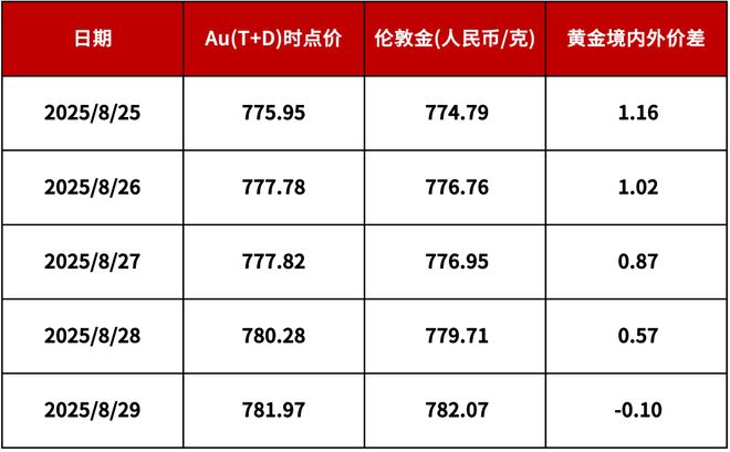 沪银主力合约与现货升贴水情况 (截至2025年8月29日) 境内外价差情况 上周,黄金境内外价差震荡下行,最低触及-0.10元/克,最高触及1.16元/克,收盘报-0.10元/克,建议投资者审慎参与,重点关注逢高做窄交易机会。