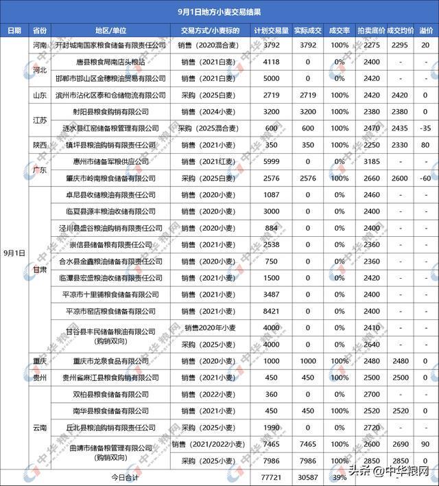 据最新公开数据,截止8月31日,河南全省涉粮企业共收购新产小麦1893.1万吨,其中,市场化收购1216.2万吨;最低收购价收购676.9万吨。截止到8月28日,安徽托市收购小麦256万吨左右。 综合市场形势来看,小麦最近向下跌不动卷不下去,供需双方僵持平稳了几天,面粉厂低价采购不断流拍,那就意味着行情很大概率发生转机,部分上量少的厂家可能会小幅上调小麦收购价格。 储备企业和面粉厂小麦采购价格 9月1日山东滨州市沾化区泰和仓储物流有限公司竞价采购2025年白小麦2718.59吨,全部成交,底价2420元/吨成交。 9月1日涟水县红窑储备粮管理有限公司竞价采购2025年小麦600吨,全部成交,底价2470,成交价2435元/吨。 9月1日益海(石家庄)粮油工业有限公司竞价采购2025年产师栾02-1数量1000吨,底价2870,全部成交。 9月1日益海嘉里(郑州)食品工业有限公司竞价采购小麦5400吨,其中 2025年普麦底价2446,新麦26底价2840,中麦578底价2650,丰德存五号底价2580,伟隆169底价2580,均全部流拍。 9月1日益海嘉里(北京)粮油食品工业有限公司竞价采购2025年普麦3000吨,底价2435,全部流拍。 9月1日五得利集团周口面粉有限公司采购3000吨2022-2025年江苏、安徽、河南产红小麦,底价2480,全部流拍。 9月1日五得利集团新乡面粉有限公司采购2000吨2020年河北、山东、河南、安徽产小麦,底价2456,全部流拍。 9月1日五得利集团遂平面粉有限公司采购2000吨2021-2024年河南、安徽产小麦,底价2440,全部流拍。 9月1日五得利集团临沂面粉有限公司采购5000吨2022年江苏、山东、安徽产小麦,底价2444,全部流拍。 9月1日五得利集团渭南面粉有限公司采购3000吨2021年-2025年产白普麦,成交500吨,底价2444,成交价2444。 图1:9月1日主产区面粉厂小麦收购价格 图2:9月1日地方储备小麦交易结果 图3:9月1日中央储备小麦交易结果 |