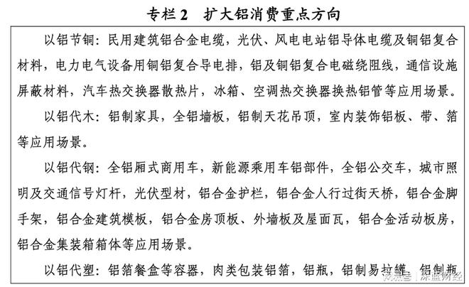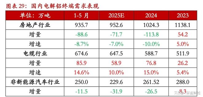 (图源:卓创资讯) 光伏领域用铝需求增长更为明显。卓创资讯数据显示,2024年国内光伏市场用铝量为480万吨,较2023年增加61.55万吨。 根据中国有色金属加工工业协会数据,2024年全国铝材综合产量达4900万吨。意味着上述两个行业,消耗了约1/5的铝材综合产量,是真正的“用铝大户”。 在过去几年高速增长的基础上,接下来重点行业的铝消费需求将如何演绎?根据卓创资讯数据,预计未来五年,汽车行业铝消费量或将保持增长态势,预计2025年至2029年,汽车市场用铝量将提升至450万至550万吨区间。 而国际铝协此前发布的《中国汽车工业用铝量评估报告(2016-2030)》则作出了更积极的预测。报告预测,中国汽车行业的用铝量将从2018年的380万吨增加到2030年的910万吨,年复合增长率为8.9%。 光伏方面,卓创资讯预计2025年至2029年用铝量将继续提升至550万至600万吨区间。这意味着,未来几年内,这两个重要行业的用铝需求虽然不再像过去那样快速增长,但仍将保持稳健上升态势。而这无疑会为电解铝行业维持较高的景气度提供坚实的支撑。 2 新兴应用场景带来更大想象空间 “用铝大户”需求稳健,而更多的新兴行业对铝的需求,为电解铝的“未来”带来了更大的想象空间。得益于优良的物理性能,铝在许多领域中大显身手,表现明显的如电缆行业。 传统上,电线电缆中铜金属的使用量较大,这主要因铜的导电性能良好。但铜的成本相对较高,且铜的密度高,铜线偏重。如今,在降成本以及轻量化要求下,以铝节铜、以铝代铜已成为电线电缆行业的显著趋势。 今年3月,工业和信息化部等十部门关于印发《铝产业高质量发展实施方案(2025—2027年)》的通知中明确将以铝节铜作为扩大铝消费的重点方向,并具体提到民用建筑铝合金电缆,光伏、风电电站铝导体电缆等应用场景。