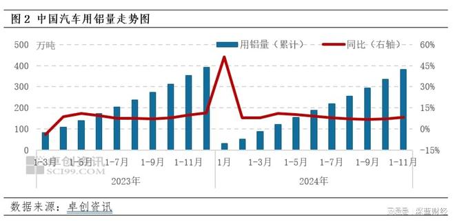 铝,这种日常生活中随处可见的金属,在工业领域正变得越来越炙手可热。 得益于低密度带来的轻量化优势,以及良好的导热、导电性能,再加上耐腐蚀、延展性强等特征,铝在全球范围内被广泛应用于交通、电力、建筑、食品医疗等领域。 近年来,新能源汽车和光伏储能等新兴产业的爆发,推动了铝消费的增长,也让电解铝产业迎来了新一轮景气周期。而接下来,交通运输、高压输电、低空经济等领域用铝需求的提升,将进一步推动铝消费,电解铝行业有望继续保持高景气度运行。 1 “用铝大户”支撑行业高景气度运行 过去两年,电解铝价格保持偏强震荡走势。 2024年3月起,在宏观情绪偏暖及旺季需求恢复的推动下,铝价进入强势上涨通道。2024年5月30日,SHFE铝(以下简称“沪铝”)价格盘中突破22000元/吨。 随后铝价虽有一定回调,但整体上仍保持高位震荡走势,并持续至今。8月26日,沪铝收于20715元/吨,年内涨幅超过5%。 传统上,建筑、地产等行业是“用铝大户”。但过去两年,铝消费呈现明显的变化——从地产驱动转向了新能源驱动。以新能源汽车、光伏储能为代表的新能源产业铝消费大幅增长。 卓创资讯发布的数据显示,2024年国内汽车市场用铝量为425万吨,较2023年增加33.24万吨,增幅8.48%。