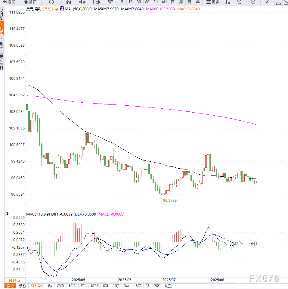 周二早盘,美元在亚洲交易中小幅回升,美元指数上涨0.1%至97.709,结束此前的连跌走势。此前,投资者因担忧白宫过度干预美联储,纷纷抛售美元,转向黄金等避险资产。 ![]() 欧元小跌至1.1707,因最新数据显示欧元区制造业PMI在8月实现三年来首次扩张。澳元结束五连涨,微跌0.1%至0.6549,仍接近两周高点;纽元持平于0.5903;英镑小幅回落0.1%至1.3539,从周一创下的两周高点回落。。 未来几日,美国8月经济数据将成为市场焦点,包括ISM制造业与服务业PMI以及非农就业报告。投资者将借此评估特朗普政策对美国工业与就业的冲击。 从日线走势来看,美元指数近期五连跌后在97.50附近获得支撑,短期阻力位在98.20至98.50区间。若反弹受阻并回落,可能再度测试97.20的关键支撑。 技术指标方面,RSI徘徊在40附近,显示动能偏弱,MACD仍在零轴下方,暗示美元指数反弹力度有限,趋势依旧偏空。 ![]() 美元短期走势受政策干扰与经济数据双重牵制。在美联储独立性存疑之际,黄金成为避险主线,短期内仍有进一步走高的可能。若即将公布的非农与PMI数据不及预期,美元或再度承压,黄金有望继续刷新阶段高点。 |
