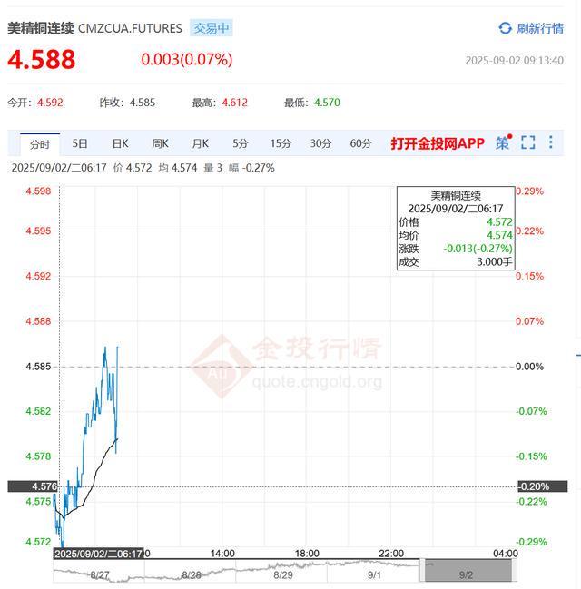 9月2日美精铜连续最新价格为4.588美元,价格较昨日上涨0.07%。