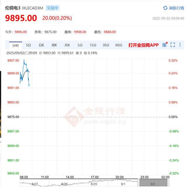 2025年9月2日外围铜价:今日伦敦铜继续高开高走,最新价格为9895美元,价格较上一个交易日上涨0.20%。