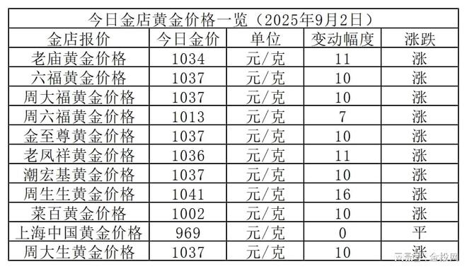 9月2日国内黄金市场动态:国内品牌金店金价保持上涨,再创新高。其中,周生生黄金上涨16元/克,报1041元/克,为最高价金店。上海中国黄金价格还是不变,报价969元/克,为最低价金店。今日的金店高低价差已经来到了72元/克。 具体各大品牌金店最新价格见下表格: