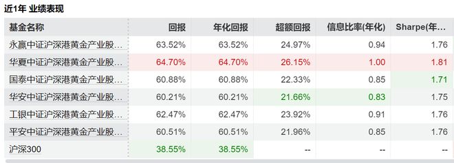 数据来源:Wind截至:2025.09.01 因此,在收益率差不多的情况下,选择费率相对低廉的ETF或是相对更实惠的方式。从费用上看华夏黄金ETF、工银黄金ETF、富国上海金ETF、天弘上海金ETF这四支ETF在费率上是有一定优势的,长期投资可以适当关注。 讲完了黄金ETF那我们来讲讲黄金股ETF,虽说是一字之差,但是当中的学问可多了: 不同于黄金ETF的通俗易懂,黄金股ETF主要投资于黄金矿业上市公司的股票,收益取决于这些公司的经营业绩、股价表现,间接关联金价,但受公司自身因素影响更大。 也就是说,除了金价波动风险,还需承担上市公司的经营风险、股市波动风险,可能因公司盈利增长实现上涨,也可能因业绩亏损导致下跌。 其中比较有代表性的指数就是中证沪深港黄金产业股票指数,其成分股聚焦黄金全产业链,涵盖紫金矿业、山东黄金等A股矿业龙头,以及周大福、招金矿业等港股企业。 指数波动率较高(近1年波动率1.87%-1.95%),与金价及矿业公司盈利强相关,2025年上半年受益于地缘冲突与通胀预期涨幅达37.75%,属于高风险、高波动品种。 那高风险对应的就是高收益了。今年,A股市场“反内卷”的风也同样吹到了中证沪深港黄金产业股票指数中。从跟踪该指数的产品中可以看出,近一年收益率基本维持在60%以上。 其中华夏中证沪深港黄金产业股票ETF和工银中证沪深港黄金产业股票ETF表现较为突出。华夏中证沪深港黄金产业股票ETF的回报达到64.70%,年化回报同样为64.70%,超额回报也领先于其他产品;而工银中证沪深港黄金产业股票ETF的回报为62.47%,年化回报62.47%,超额回报23.92%,在风险调整后的收益(如Sharpe比率为1.76)方面也表现出色。这两只基金在控制风险的同时实现了较高的收益增长。