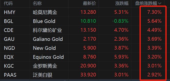 格隆汇9月2日|金价再创新高,带动美股黄金股盘前集体上涨,其中,哈莫尼黄金涨超7%,科尔黛伦矿业涨4.5%,New Gold、DRDGOLD、金罗斯黄金涨超3%。