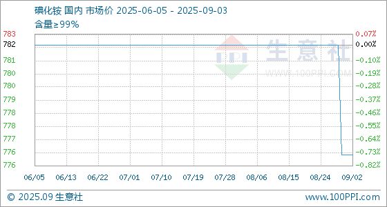 9月3日,生意社碘化铵基准价为776.67元/千克,与本月初持平。