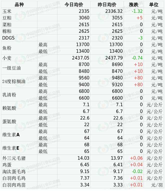市场评论—关注焦点 玉米 3日全国均价总体小幅回落走势为主,局部地区窄幅震荡,波动地区减少总体涨少跌多。国内主产区新玉米将陆续上市,贸易商观望心态逐渐转强,饲料企业以消化小麦和玉米库存为主,深加工企业也保持随采随用策略,现货价格以弱势调整为主。总体上9月份期间大多数时候玉米市场多空因素继续维持势均力敌略偏弱态势不变,预判9月份期间期间大多数时候产区玉米交易价格总体呈稳中窄幅波动、略显偏弱走势为主的几率更高,9月份月度均价环比继续下跌的可能性更大。 DDGS 3日DDGS价格小跌。近期下游市场需求疲软,饲料企业仍有部分库存,采购多持观望心态,继续补货意愿不强,市场成交较平淡,部分企业降价出货。9月份,我国玉米深加工企业生产将继续处于生产淡季,部分生产企业检修结束恢复生产,理论上DDGS新增产供量将继续增长但增幅有限,需求端养殖及饲料生产所消耗DDGS数量将继续增长但增幅逐步收窄。 豆粕 因中国仍对美国新季大豆缺乏兴趣,中西部地区降雨有助于晚播大豆作物生长,CBOT大豆期货收盘下跌,基准期约收低1.3%,创下一周半来的最低水平。目前国内进口大豆供应充足压榨量保持高位,豆粕产量较大,终端饲料养殖企业补库较谨慎,出货数量有限,库存继续增加,供应维持宽松局面令价格维持震荡状态。美国大豆天气窗口即将关闭,新作大豆上市后供应压力及中美贸易谈判进展是市场关注焦点,继续关注中美贸易谈判结果对市场的指引。 棉粕 今日棉粕市场价格波动有限。进口大豆保持高开工率,上周压榨量在243万吨左右,豆粕库存升至106.3万吨,周度增加1.6万吨。豆粕库存高企,限制油厂提高粕价,利空棉粕。但是棉籽价格坚挺,对成本支撑。同时目前棉油厂受开机率低位棉粕供应压力不大。预计棉粕行情呈现震荡调整,走势相对独立。 菜粕 今日郑州菜粕期货低开后震荡上行。加拿大油菜籽期货市场收盘上涨,基准期约收高0.62%,主要反映了其他植物油市场走强,大草原油菜籽收获进度缓慢。菜粕现货相对稳定,成交清淡。上周菜粕库存增至2.5万,华南颗粒粕库存20万,葵粕库存增至12.2万吨。菜籽压榨及下游提货量均偏低,颗粒粕供应仍充足,市场继续关注后期菜籽原料供应情况。 超级蒸汽鱼粉 外盘方面,秘鲁新季超级蒸汽鱼粉预售参考价格为CNF1750美元/吨,由于产量小,近日日本级鱼粉成交增加,提振日本级鱼粉价格。9月10日将展开声纳学考察。国内进口鱼粉方面,当前秘鲁超级蒸汽鱼粉价格集中在13400-13700元/吨,日本级鱼粉价格为12400-12800元/吨。短期鱼粉市场观望保持。 小麦 今日小麦市场价格震荡调整,市场购销平稳。目前小麦市场整体弱势稳定,面粉厂调价较少,部分贸易商和粮点腾仓出库导致阶段性供应压力加大。临近新玉米上市,部分粮商售粮积极,市场粮源供应表现充足;部分售粮无利润持粮待涨。制粉企业开机较前期改善,但建库意愿依旧不高,刚需采购;饲料企业观望新玉米上市情况,小麦消耗前期库存为主。短期小麦市场将继续维持当前 “大稳小动” 的弱势稳定格局,价格上下波动的空间均十分有限。 油脂 昨日CBOT豆油市场小幅回升。昨日马来西亚棕榈油市场强势反弹,收到低吸买盘和强劲出口的支撑。中国粮油商务网监测数据显示,截至上周末,国内三大食用油库存总量为270.17万吨,周度增加10.93万吨,其中豆油库存增加5.29万吨,食用棕榈油和菜油库存分别增加4.06万吨和1.59万吨。豆油现货受库存压力和出口需求等多种因素影响,短期内有小幅反弹趋势。国内棕榈油现货价格跟随期货市场走高,但终端消费平淡,限制了市场涨幅,预计短期棕榈油市场或维持震荡偏强格局。 乳清粉 近日港口乳清粉到货量好转,价格大幅回调后,市场询单增加,购销好转,报价止跌趋稳。 赖氨酸 2025年7月,我国赖氨酸与赖氨酸盐及酯的出口量为8.8万吨,同比增2.9%。万里润达氨基酸生产线计划近日阶段性升级检修。近日厂家报价下调,市场偏弱整理。 蛋氨酸 2025年7月国内蛋氨酸进口量为1.53万吨,同比增95%.赢创宣称计划第三、四季度分别对其新加坡工厂和安特卫普工厂进行为期6-7周的技术升级。紫光蛋氨酸计划8月初开始检修50天。6月新和成与中石化合资合作的液体蛋氨酸项目已进入试生产阶段。新和成蛋氨酸工厂计划于7月下旬至8月上旬轮流检修。8月4日市场称希杰蛋氨酸报价22.5元/公斤。8月7日市场称新和成将适当延长蛋氨酸生产线的检修时间。 维生素A 欧洲VA1000市场报价19.5-22欧元/公斤。2025年3月万华化学VA产业链投产,5月16日市场称帝斯曼VA生产线计划从7月中旬起按计划停产检修14周。6月印度通报称对涉华维生素A棕榈酸酯征收反倾销税。6月12日巴斯夫VA解除不可抗力影响。7月16日市场称有厂家报价小涨,市场询问增加。 维生素E 欧洲VE市场报价8.5-9欧元/公斤。山东新和成VE生产线计划于6月上旬开始检修10-12周。浙江医药昌海生物分公司VE生产线计划自6月初检修至9月初。帝斯曼VE生产线计划从7月中旬起按计划停产检修6周。北沙制药计划7月开始停产检修10-11周。7月4日市场称新和成VE报价78元/公斤。7月16日市场称国内厂家签单价格小涨,市场购销好转。8月7日BASF宣称VE产品解除不可抗力状态。 外三元毛猪 全国均价为 14.03元/公斤,较昨日价格上涨0.42%。开学季叠加中秋备货,终端消费需求明显释放,屠企开工率提升推动