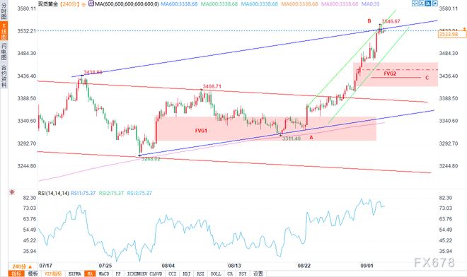 在平均线(MA)印证的长期上升趋势中,红色通道线类似一个大型“看涨旗形”形态。 通过7月和8月的价格极值,我们可勾勒出一条上升轨迹(以蓝色显示)。目前金价正接近该轨迹的上轨,考虑到相对强弱指标(RSI)发出超买信号,且过去10天金价累计上涨逾6%、投资者或存在获利了结意愿,此处可能引发回调。 从看涨视角来看,潜在回调目标或指向由以下要素构成的支撑区域: FVG2。尽管FVG2不完全符合标准构建规则,但它反映了“买方主导的市场失衡”,正是这种失衡推动金价大幅上涨。空头曾试图在3500美元这一心理关口附近抵抗,但最终未能成功。 C水平。该水平代表AB上涨浪的50%斐波那契回撤位。 需注意的是,如绿色趋势线所示,当前上涨动能尚未耗尽。 【免责声明】本文仅代表作者本人观点,与汇通财经无关。汇通财经对文中陈述、观点判断保持中立,不对所包含内容的准确性、可靠性或完整性提供任何明示或暗示的保证,且不构成任何投资建议,请读者仅作参考,并自行承担全部风险与责任。 |