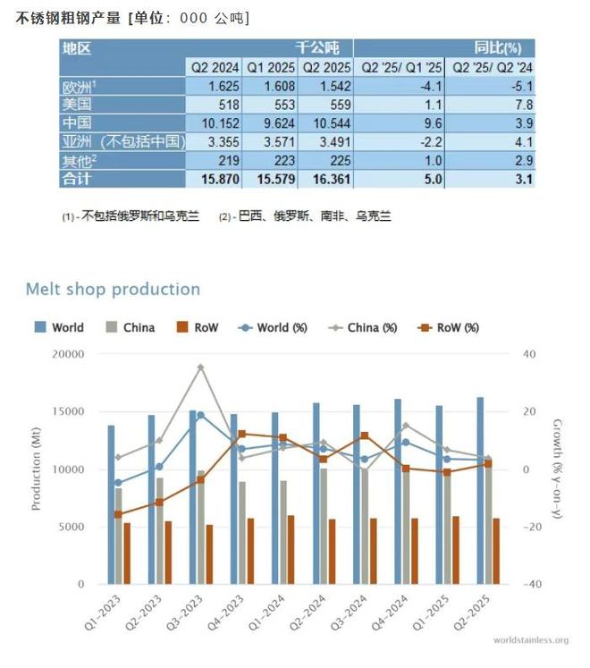 世界不锈钢协会发布的2025年第二季度的数据表明,前六个月的不锈钢粗钢产量为3190万吨。