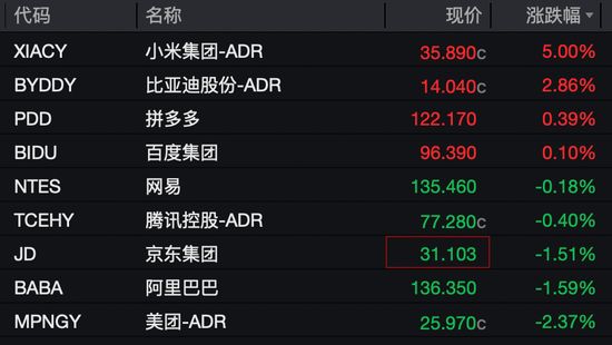 中概股科技巨头则涨跌不一。截至发稿,小米集团涨5%,比亚迪涨近3%。
