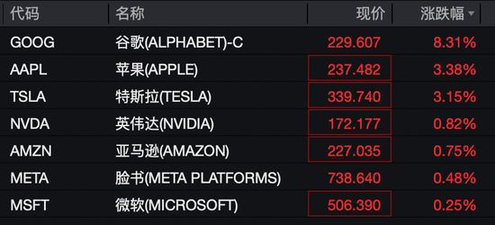 美国科技七巨头全线上涨。截至发稿,谷歌涨超8%,苹果、特斯拉涨超3%。