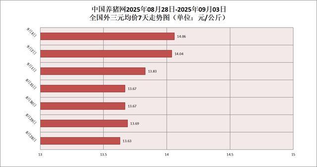 2025年09月03日(星期三),据中国养猪网猪价系统监测,全国外三元均价为14.06元/公斤,猪价较昨日(14.04元/公斤)上涨了0.02元/公斤,较上月(14.25元/公斤)下跌了0.19元/公斤。 其他生猪品种方面,生猪内三元均价为13.76元/公斤,价格较昨日(13.56元/公斤)上涨了0.20元/公斤;生猪土杂猪均价为13.61元/公斤,价格较昨日(13.35元/公斤)上涨了0.26元/公斤。 全国外三元、土杂猪、内三元生猪品种价格出现强势上涨行情,具体的涨跌情况请看下文分析! 2025年08月28日-2025年09月03日(7天)外三元均价走势图 今日部分省份/直辖市/自治区外三元、内三元、土杂猪均价: 1、外三元方面:山东省14.11元/公斤、陕西省14.00元/公斤、湖南省13.89元/公斤、天津市14.05元/公斤、广东省15.67元/公斤、黑龙江省13.50元/公斤、云南省14.12元/公斤; 2、内三元方面:江西省15.20元/公斤、甘肃省13.40元/公斤、河南省13.98元/公斤、天津市13.90元/公斤、广西壮族自治区12.21元/公斤、吉林省3.24元/公斤、云南省14.23元/公斤; 3、土杂猪方面:江苏省13.75元/公斤、宁夏回族自治区13.02元/公斤、湖南省14.52元/公斤、北京市15.00元/公斤、广东省15.00元/公斤、黑龙江省13.20元/公斤、重庆市14.80元/公斤。 玄田算法是由项目课题组团队原创的非经典逻辑数值聚合理论和不确定性预测方法,构建了基于一致模算子的生猪价格预测模型。该模型采用的聚合函数及一致模相关理论与方法已获得多项国家自然科学基金和省级自然科学资金资助,并获得多项省级自然科学奖奖项。09月04日预测猪价为14.2292,置信区间在13.7136--14.7536之间。09月05日预测猪价为13.1756;09月06日预测猪价为14.2870。 2025年09月04日玄田算法预测 今日外三元猪价走势简评: 国内外三元生猪价格价格维持上涨走势,市场呈现大范围飘红行情。在全国可监测的31个省/市/自治区中,猪价走势为15涨2平14跌。猪价最高地区海南省16.15元/公斤,最低地区新疆12.78元/公斤。当前猪价上行主要受多重短期因素推动:月初养殖端出栏节奏放缓、生猪调运政策调整、学校开学拉动备货需求以及天气转凉消费回暖,共同形成了“供减需增”的市场格局。不过,此番涨势预计难以持续。一方面,当前供应收缩仅属阶段性调整,从前期的能繁母猪存栏情况看,9月份适重猪源仍处于过剩状态,供给压力尚未根本缓解;另一方面,开学备货结束后,屠宰企业采购量将惯性减少,叠加部分地区猪场疫病风险抬头,跨区域调运难度加大,导致生猪流通效率下降,市场需求后续承接力不足。因此,尽管短期猪价有所回升,整体市场仍面临下行风险。 (备注:本文生猪价格及猪价特指活猪价格,并非是消费市场的猪肉价格,外三元、内三元、土杂猪则为生猪品种。) |