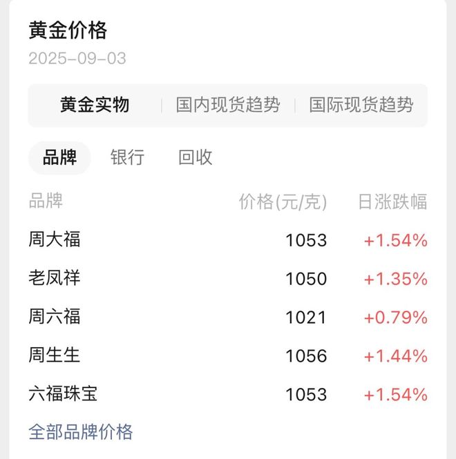 对应的上海金交所实物黄金价格,大概是810元每克。 而各大品牌的足金首饰价格,也在继续上涨。 例如周大福,已经涨到1053元/克。 看到这价格,估计很多准备结婚的人都买不下手