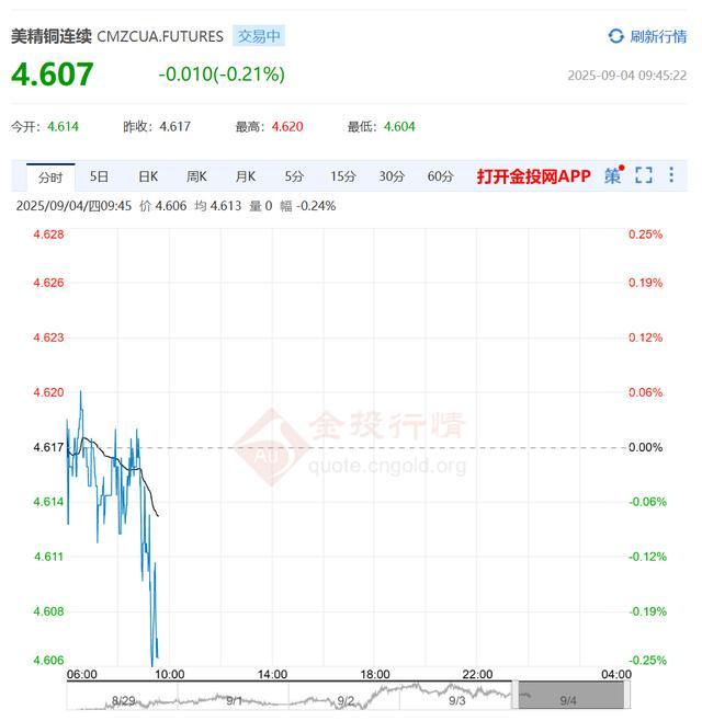9月4日,美精铜最新价格为4.607美元,价格较上一个交易日下跌0.21%。