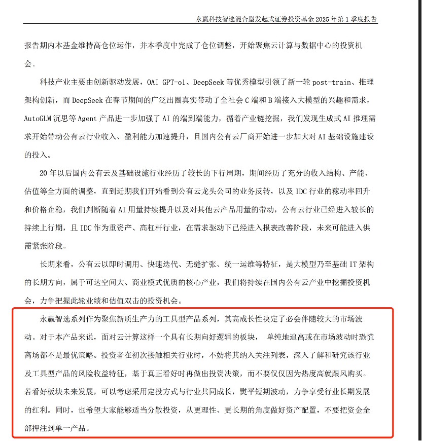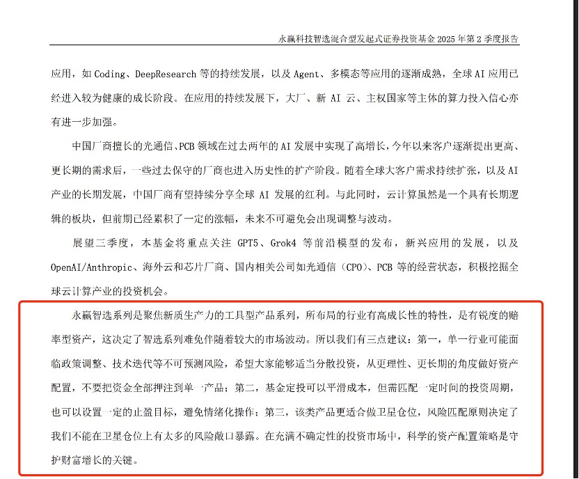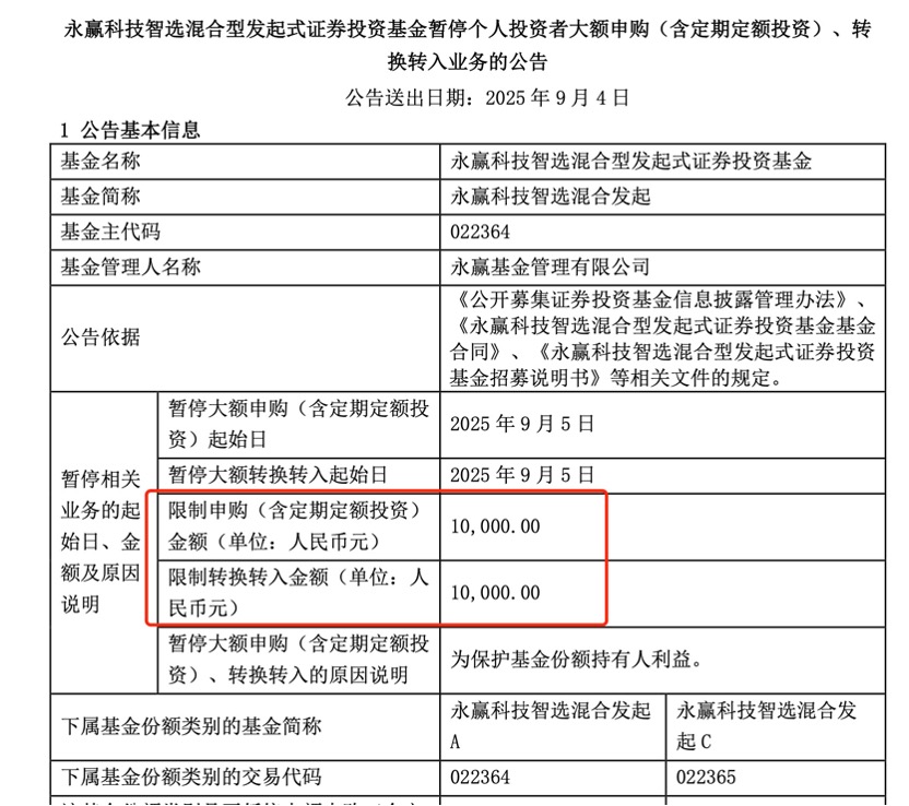 财联社9月4日讯(记者闫军)在这一波行情中,基金公司对规模愈发克制了。 先有招商均衡优选混合募集仅一天就因规模过大,紧急公告50亿元规模上限,主动新发已经难见百亿起点基金;后有“冠军基”再次限购。 9月4日,永赢科技智选公告了最新的限购计划,自9月5日起,将该基金单日申购的上限设置在1万元。据悉,该基金距离上一次的百亿限购公告仅仅过去了6天。 永赢基金表示,伴随着科技板块上涨,永赢科技智选受到投资者广泛关注。在市场热度持续提升的背景下,实施大额限购主要出于两方面考虑:一是引导投资者理性决策,避免因市场情绪冲动投入大额资金;二是合理控制基金规模增长,保持投资策略的稳定性和有效性,为持有人争取长期可持续的回报。 “冠军基”再限购 9月4日,永赢基金公告称,为保障基金份额持有人的?益,自9月5日起,永赢科技智选将单日单个基金账户的申购(含定期定额投资及转换转入)金额上限设置为1万元。 就在8月26日,永赢科技智选已经宣布了百万级别的限购,短短不足10个交易日,该基金再次限购,并将限购金额压至1万元。 业内认为,百万限购主要是机构客户闭门谢客,而限购1万则是真正的面向散户的限购了。 ![]() 限购的原因非常简单,业绩太好了,投资者蜂拥而至,给基金管理带来一定的压力,公司从投资者角度考虑出发,也不希望在业绩高点承接太多资金。 永赢科技智选是永赢旗下工具化产品“智选”系列产品之一,成立不足一年,基金经理任桀管理经验同样不足一年,凭借因持仓高度集中在CPO,年内业绩领跑市场。Wind数据显示,截至9月3日,该基金年内收益率177.8%,全市场回报率排名第一,并领先第二名近20个百分点。 ![]() 和其他“智选”系列产品类似,永赢科技智选是发起式基金,也是针对机构客户需求发行的高弹性行业主题基金,但是随着基金净值的不断上涨,吸引了个人投资者的配置。截至去年底,该基金机构投资者占比为78.22%,个人占比仅12.76%,到了今年6月底,持有人结构已经发生了逆转,机构投资者占比降至21.78%,个人持有比例增至87.24%。 ![]() 永赢智选系列今年三次提示风险 市场都关注到了永赢“智选”系列的出圈,甚至有公募也试图复制这一布局,以主动基金的形式去铺赛道型产品,理论上存在“只要赛道布局齐全,总能因市场风格轮动而受益”的可能性。但是事实上,这一布局并不简单,这既需要管理层敢于市场低位以发起式方式成立新产品,布局方向的精准把握,以及市场的配合反转,天时地利人和,缺一不可。 随着今年永赢先进制造、永赢医药创新智选、永赢科技智选等智选产品在不同阶段均有较好的表现,相关产品实力“吸金”。在人声鼎沸之时保持克制,基金公司频频出手限购、提示风险,在今年的牛市中表现得尤为明显。 以永赢基金旗下的“智选”系列为例,分别在今年一季报、二季报以及最近的中报中提示风险,言辞也逐渐恳切。 在今年中报中,永赢科技智选基金表示,公司在季报中连续提示,永赢智选系列是聚焦新质生产力的工具型产品,所布局的行业具有高成长性的特性,难免伴随着较大的市场波动。越是在市场热度高的时候,越是要认识到做好适当性管理的重要性,根据自身风险承受能力审慎决策。 永赢基金表示,作为基金管理人,公司希望先讲风险,再谈收益,投资者要充分了解基金的风险收益属性,才能确定自己是否适合做这个投资。 在投资之前,要先问自己三个问题:第一,这个产品的底层资产是什么,是否已经通过底层资产了解清楚产品的特性?第二,这类产品历史的最大回撤是多少,假如遇到极端情况,自己能否接受?第三,这笔投资期限有多长,自己对产品的预期收益率在什么区间以及是否愿意为此承担较大风险? “由于投资者行为的不确定性,投资者的真实收益和基金收益率总是存在一定的磨损,唯有更加理性的投资动作才能把基金净值转化为实实在在的投资者收益。”永赢基金表示,分散投资、定投并设置止盈止损目标、不暴露太多风险敞口,用科学的资产配置策略守护财富。 早在今年一季报,永赢科技智选混合就表示,面对云计算这样一个具有长期向好逻辑的板块,单纯地追高或在市场波动时恐慌离场都不是最优策略。投资者在初次接触相关行业时,不妨将其纳入关注列表,深入了解和研究该行业及工具型产品的风险收益特征,基于真正看好时再作出投资决策,而不要仅仅因为热度高就跟风购买。 若看好板块未来发展,可以考虑采用定投方式与行业共同成长,熨平短期波动,力争享受行业长期发展的红利。同时,也希望大家能够适当分散投资,从更理性、更长期的角度做好资产配置,不要把资金全部押注到单一产品。 ![]() 到了二季度,永赢基金再次提示投资,永赢智选系列是聚焦新质生产力的工具型产品系列,所布局的行业有高成长性的特性,是有锐度的赔率型资产,这决定了智选系列难免伴随着较大的市场波动。 所以,在配置上给出三点建议: 第一, 单一行业可能面临政策调整、技术迭代等不可预测风险,希望大家能够适当分散投资,从更理性、更长期的角度做好资产配置,不要把资金全部押注到单一产品; 第二, 基金定投可以平滑成本,但需匹配一定时间的投资周期,也可以设置一定的止盈目标,避免情绪化操作; 第三, 第三,该类产品更适合做卫星仓位,风险匹配原则决定了我们不能在卫星仓位上有太多的风