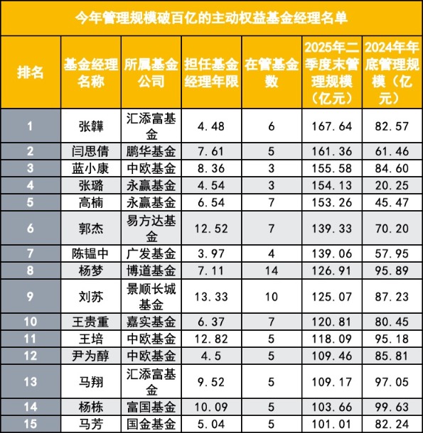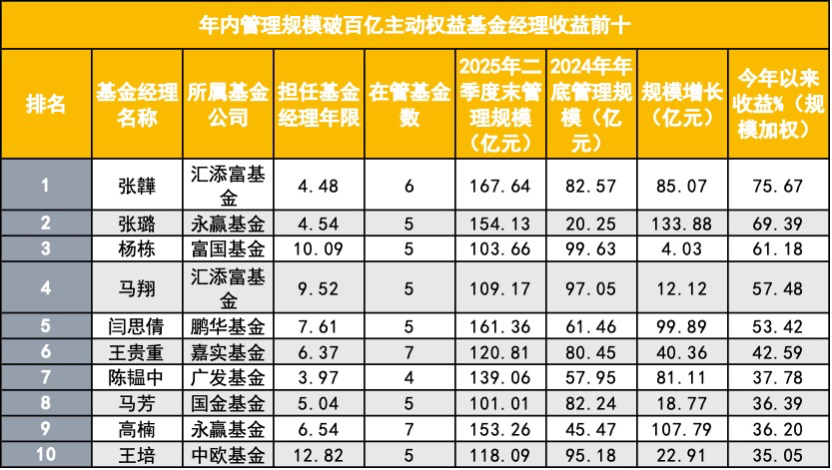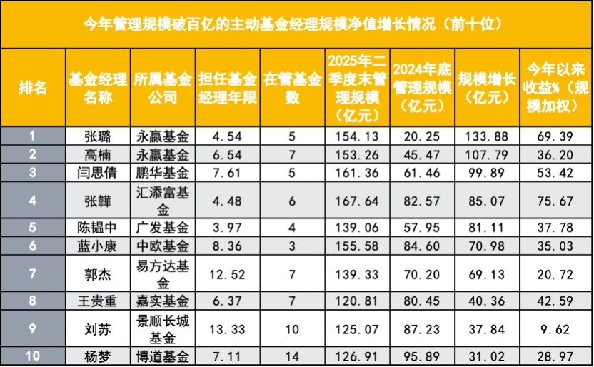 财联社9月16日讯(记者吴雨其)2025年以来,结构性行情的爆发不仅推动了一批行业主题走强,也让一批基金经理的净值与规模同步上扬。在这一轮市场环境中,一些此前还处在腰部位置的基金经理凭借出色的业绩表现迅速突围,跻身百亿俱乐部。 根据公募排排网数据统计,截至2025年二季度末,百亿级主动权益基金经理人数达到84位,较2024年末新增15位。其中,不乏此前管理规模仅二三十亿元的基金经理,如今已完成数倍扩容。张璐、张韡、杨栋等人,正是在这一轮行情中凭借业绩带动资金涌入,实现从新星到百亿的跃升。 ![]() 这批新晋百亿基金经理也呈现出鲜明的群体特征——既有多年研究背景积淀的老兵型选手,也有?几年在强主题行情中快速成长的新锐型人物。从公司分布来看,汇添富、中欧、永赢三家基金公司最为突出,分别有多位基金经理上榜,进一步巩固了头部公司的行业话语权。而从这些基金经理的重仓路径来看,宁德时代、胜宏科技、腾讯控股等股票被多位经理同时持有,行业共识与投资风格在这批人身上达成统一。 业绩先行,谁在凭实力闯进百亿俱乐部? 一位业内人士评价,过去要成为百亿基金经理,往往需要数年时间沉淀,而这届新晋百亿,只用了半年。今年以来,A股结构性上涨行情给了主动权益投资者表现空间,而谁能把握住节奏、实现收益与规模共振,就成为突围的关键。 根据公募排排网的统计,以今年以来收益为指标(截至9月15日晚净值更新),今年晋升百亿的基金经理中,TOP10的上榜门槛为35.05%。位列前三的分别是汇添富基金张韡(75.67%)、永赢基金张璐(69.39%)和富国基金杨栋(61.18%)。 其中,张韡无疑是今年上半年市场关注度最高的新晋百亿代表。他管理的基金以医疗健康方向为主,共有6只产品,典型产品如汇添富创新医药混合、汇添富医疗服务灵活配置混合、汇添富全球医疗混合(QDII)人民币等。根据二季报数据,其前十大重仓股中,恒瑞医药、信达生物、三生制药等多个医药标的涨幅显著,其中三生制药单季度涨幅高达97.74%,直接带动其产品净值飙升。 张璐则是风格迥异的另一种典型。她以指数增强、量化选股见长,产品集中押注机器人产业链,如浙江荣泰、德昌电机、伟创电气等。在策略高度集中的基础上,张璐通过量化模型选择产业趋势较强、估值合理的公司,实现了收益与规模的同步放大。 杨栋则延续了其在成长股方向的深耕路径。他所管理的富国均衡优选、积极成长等产品重仓胜宏科技、宁德时代、联创光电、腾讯控股等高景气板块,其中胜宏科技在AI算力逻辑带动下二季度涨超66%,成为业绩主因之一。 完整来看,这批收益靠前的“新晋百亿基金经理TOP10”名单,还包括中欧基金蓝小康、汇添富基金马翔、鹏华基金闫思倩、嘉实基金的王贵重等均在各自行业赛道内实现超额收益。 ![]() 规模猛增到百亿,这届新晋基金经理跑得太快了 与业绩并驾齐驱的,是资金的强势流入。谁能从市场手中接住子弹,谁就更有可能成为平台重点打造的核心人物。 若以2025年上半年管理规模净增长为标准,新晋百亿基金经理中,TOP10的“入围线”为31.02亿元。榜单前两位被永赢基金包揽,分别是张璐(净增长133.88亿元)和高楠(净增长107.79亿元),形成明显的“吸金双子星”。 张璐年初的管理规模仅为20.25亿元,在上半年业绩表现强劲的基础上,半年实现了超7倍的增长,二季度末已达到154.13亿元。这一数字并非偶然,而是机构资金在高频追逐量化增强类产品背景下的自然选择。 高楠则从45.47亿元增长到153.26亿元,他代表另一种“风格稳健、配置型主力”的路线。作为永赢基金的首席权益投资官,他所管理的7只产品覆盖面更广,布局更分散,重点押注成长与消费结合的跨周期赛道。从重仓股看,泡泡玛特、新易盛、信达生物、胜宏科技等均为近期市场中受益于消费复苏与AI交叉逻辑的强势标的。 除永赢“双子星”外,中欧基金的蓝小康今年上半年管理规模增长了70.98亿元,最新规模为155.58亿元。 鹏华基金的闫思倩也交出了一份优秀的“吸金”成绩单。她管理规模从2024年末的61.46亿元增长至161.36亿元,净增99.89亿元,代表产品为鹏华碳中和主题等。其重仓标的多聚焦于电子、信息技术及新能源制造,呈现典型的成长抱团风格。 此外,广发基金的陈韫中、汇添富基金的张韡、易方达基金郭杰的等人也进入了规模增长TOP10榜单,他们分别在指数增强、医药、AI科技等主题中发力,各自产品组合在短时间内获得大量新增申购,助推规模快速膨胀。 一位公募渠道负责人表示:“从TOP10名单可以看出,‘百亿突围’的方式越来越多样。过去是长期积累,现在可能是短期内一个点打爆就能吸到大规模资金。但前提是你要有故事、有框架、有方向。” ![]() 从二线到主力,新晋百亿经理崛起背后的共性 回顾这15位新晋百亿基金经理的成长轨迹,不难发现:他们大多不是空降突围者,而是在过去数年中稳扎稳打、厚积薄发的耐心型选手。 根据统计,这批新晋百亿经理中,全部具备至少四年以上投资经验,其中四人从业时间已超过10年。张韡、杨栋等人都曾长期担任研究员或研究组长,深耕一个细分行业多年后才转任基金经理,其底层研究体系稳定性强,组合构建理念成熟。 更值得关注的是,这批基金经理大多来自于投研体系扎实、内部协同良好的平台型公司。汇添富、中欧、永赢三家公司均