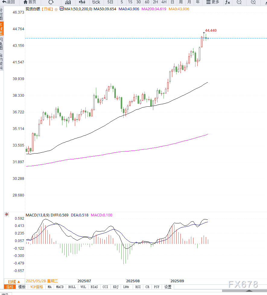 银价在欧洲交易时段小幅回落至约44.00美元/盎司,但仍接近14年高位的44.47美元。市场普遍预期美联储将在10月降息25个基点,以应对经济放缓与劳动力市场趋软。 ![]() 银价的另一个支撑因素来自不断升温的地缘政治紧张局势。北约警告俄罗斯将采取“必要的军事和非军事措施”以保障自身防御,而美国总统特朗普表示,乌克兰可能收回俄罗斯占领的所有领土。 乌克兰总统泽连斯基在联合国发言中呼吁世界力量结束冲突,警告此举可能引发危险的军备竞赛。据市场调查显示,这些消息增加了投资者对贵金属避险属性的需求。 从日线图来看,银价在周二触及14年高点44.47美元后略有回落,但仍在上行趋势中运行。日线K线显示连续收阳,短期均线(5日、10日、20日)呈多头排列,支撑近期上涨势头。 44.47美元附近构成短期阻力,若价格有效突破,有望进一步挑战45.00美元心理关口。下方支撑位在43.50美元附近,如果回踩并企稳,该区域可为多头提供低吸机会。 振荡指标如RSI接近70,但尚未明显超买,显示上涨动力仍在,但需留意回调风险。整体来看,日线结构偏多,短期上涨空间仍可期,但应关注关键阻力和宏观消息带来的波动。 ![]() 银价短期维持高位,主要受美联储降息预期和地缘政治紧张双重支撑。技术面显示,日线趋势偏多,44.47美元为近期阻力,突破后有望上探45.00美元心理关口;下方43.50美元支撑稳固,可为多头提供低吸机会。 密切关注周五美国PCE和GDP数据,这两项关键宏观指标将直接影响美联储政策预期及银价后续走势。 |