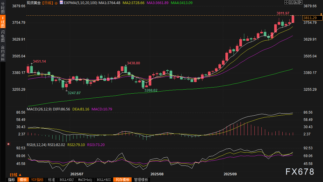 周一(9月29日)亚洲交易时段,黄金价格延续涨势,首次突破每盎司3800美元心理关口,截止14:00,最高触及3814.95美元/盎司,涨幅约1.43%。此番上行得益于美国最新通胀数据符合市场预期,巩固了投资者对美联储将在年内继续降息的判断,美元指数持续走软。由于低利率环境会降低持有无息资产黄金的机会成本,这对金价构成有力支撑。叠加持续的地缘政治不确定性,美国政府面临关门风险,市场对黄金等避险资产的需求进一步升温。 ![]() 据美国经济分析局上周五报告,美国个人消费支出(PCE)价格指数8月同比上涨2.7%,较7月的2.6%略有上升,符合市场预期。核心PCE价格指数(不包括波动较大的食品和能源价格)8月同比上涨2.9%,与7月增幅及分析师预期一致。按月计算,PCE和核心PCE分别上涨0.3%和0.2%。 独立金属交易员Tai Wong表示:“月度PCE数据符合预期,尽管个人收入和支出数据比预期高出0.1个百分点。这些数据不会阻止美联储在10月会议上继续谨慎降息。” 根据CME FedWatch工具,市场目前预计10月降息的可能性接近88%,12月再次降息的可能性为65%。美元指数因此走软,上周五下跌约0.28%,周一亚市延续跌势,一度下跌0.29%至97.88。 美国总统唐纳德·特朗普将于周一在白宫会见国会四大领袖,因为政府可能面临停摆的最后期限即将来临。如果没有拨款立法,政府部分部门将在周三(美国政府2026财年第一天)关闭。 黄金前景乐观,但RSI超买需警惕 黄金价格当日表现积极。从长期来看,贵金属的看涨基调依然稳固,价格保持在关键的100日指数移动平均线(EMA)上方。然而,14日相对强弱指数(RSI)位于75.90附近,处于超买区域。这表明,在短期内进一步盘整或暂时回落的可能性不能排除,随后才可能继续上行。 现货黄金的关键阻力位在3800美元至3810美元区间,这是心理关口和布林带上轨的结合处。目前已经初步上破,持续交投于该水平上方可能推动金价升至3850美元。 下行方面,黄金的初步支撑位在9月25日低点3722美元。如果收盘价跌破该水平,可能进一步下探至9月19日低点3632美元。 ![]() 北京时间14:00,现货黄金现报3813.87美元/盎司。 |