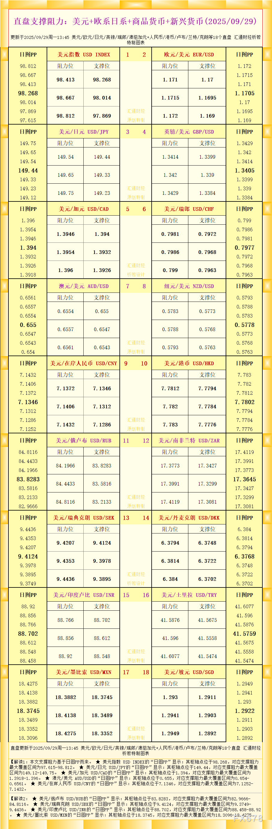 一张图看直盘支撑阻力:美元+欧系日系+商品货币+新兴货币,更新于2025年9月29日周一13:45,具体美元/欧元/日元/英镑/瑞郎/澳纽加元+人民币/港币/卢布/兰特/克朗等18个直盘,更多详见汇通财经析若特制图表中的内容。 ![]() ★ 美元指数 USD INDEX的“日图PP”显示:其枢轴点位于98.268,对应支撑阻力最大覆盖区间为97.615-98.812。 ★ 美元/日元 USD/JPY的“日图PP”显示:其枢轴点位于149.44,对应支撑阻力最大覆盖区间为149.12-149.75。 ★ 美元/加元 USD/CAD的“日图PP”显示:其枢轴点位于1.394,对应支撑阻力最大覆盖区间为1.3918-1.396。 ★ 澳元/美元 AUD/USD的“日图PP”显示:其枢轴点位于0.655,对应支撑阻力最大覆盖区间为0.654-0.6561。 ★ 美元/在岸人民币 USD/CNY的“日图PP”显示:其枢轴点位于7.1346,对应支撑阻力最大覆盖区间为7.1252-7.1432。 解读2: ★ 美元/俄卢布 USD/RUB的“日图PP”显示:其枢轴点位于83.8283,对应支撑阻力最大覆盖区间为82.9666-84.8116。 ★ 美元/瑞典克朗 USD/SEK的“日图PP”显示:其枢轴点位于9.4124,对应支撑阻力最大覆盖区间为9.3749-9.4436。 ★ 美元/印度卢比 USD/INR的“日图PP”显示:其枢轴点位于88.702,对应支撑阻力最大覆盖区间为88.458-88.92。 ★ 美元/墨比索 USD/MXN的“日图PP”显示:其枢轴点位于18.3745,对应支撑阻力最大覆盖区间为18.3096-18.4275。 更多品种解读详见图表。汇通财经原创特制,版权所有,仅供参考。 |
