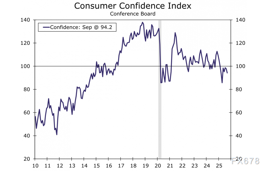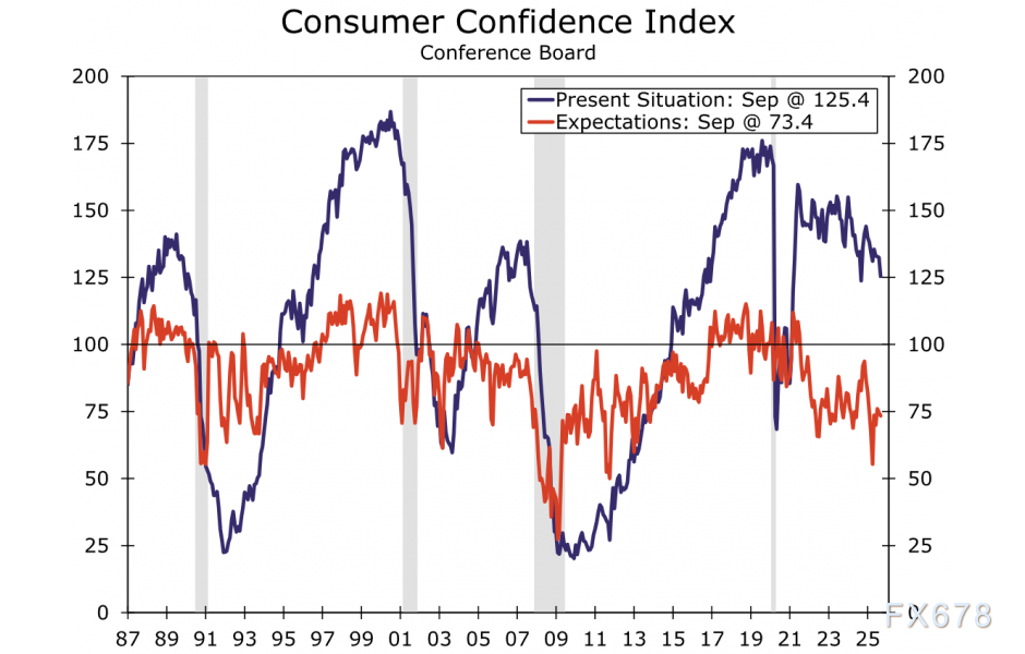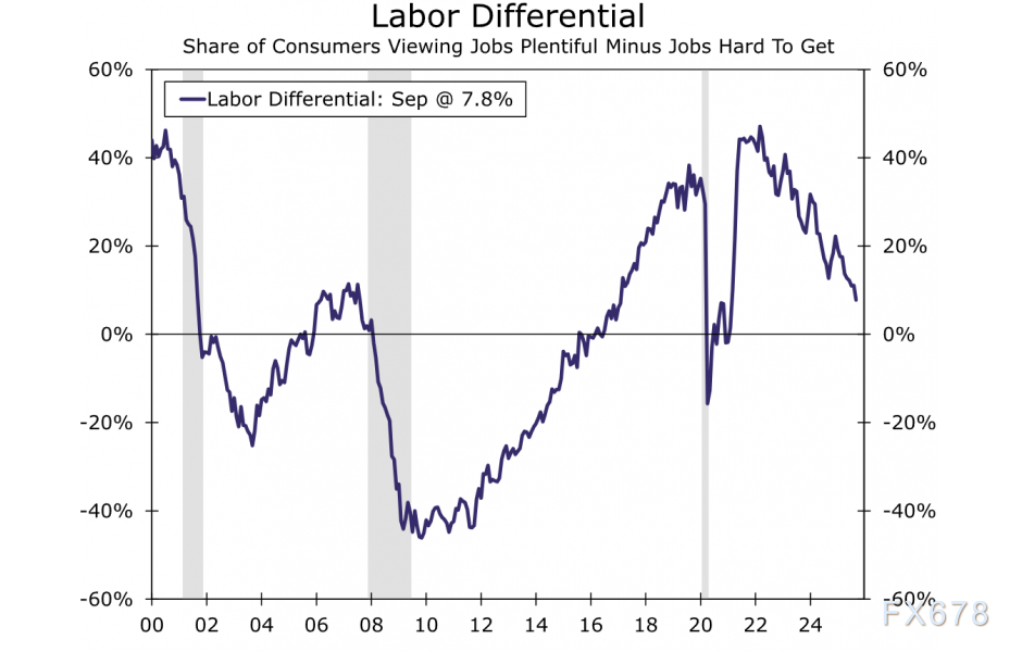 美国当前经济图景呈现“软数据”(信心)与“硬数据”(实际支出)的显著分化。透过就业差指数这一透镜可观察到消费者真实心态,其下行趋势明确指向劳动力市场动能衰退——这正是信心疲软的核心根源,也是未来政策效果与消费走势的关键变量。 ![]() ![]() 这已是四个月内消费者信心第三次下滑,而本次3.7个点的降幅最为显著。当调研显示的信心滑坡与坚挺的实际消费数据形成矛盾,我们该如何解读? 在这个被贸易战和不确定性定义的年份,经济指标屡屡出现令人费解的修正。例如上周对第二季度GDP的修正数据显示,经济增速比初值更为强劲,主要源于对消费者支出(特别是服务消费)的评估上调。 9月消费者对现状及未来12个月预期的评估双双恶化。观察图表可以直观感受到紧迫性——蓝线(现状指数)与红线(预期指数)均已逼近过去三次经济衰退前的水平。需要明确的是,市场并不认为衰退将至,但衡量情绪的软数据与反映实际支出的硬数据之间确实发出了矛盾信号。 ![]() 要准确把握当前美国消费者的真实心态,市场更倾向于借助“就业差指数”(见图表)这组透视镜。该传统指标通过“就业充足”与“就业难寻”两项数据的差值构建。其持续下行的趋势线,正映射出过去两年劳动力市场逐渐失速的实况。 ![]() 通胀预期回落正是FOMC推行后续降息所需的关键前提之一。最终,2026年降息周期与更具刺激性的财政政策形成合力,或将使消费者在明年伊始获得更坚实的基本面支撑。 美元短期将陷入多空拉锯 若就业差指数持续恶化,叠加通胀如期回落,美联储降息预期将主导市场,美元指数可能下探97.50支撑。 但硬数据韧性与通胀绝对值高企将构筑缓冲带,使美元呈现阶梯式下跌而非单边下行。 ![]() 市场后续将重点关注:就业差指数与消费者信心的同步性;硬数据(零售销售、GDP)能否持续超预期;通胀回落速度与美联储官员表态的匹配度。 北京时间11:11,美元指数现报97.82。 |