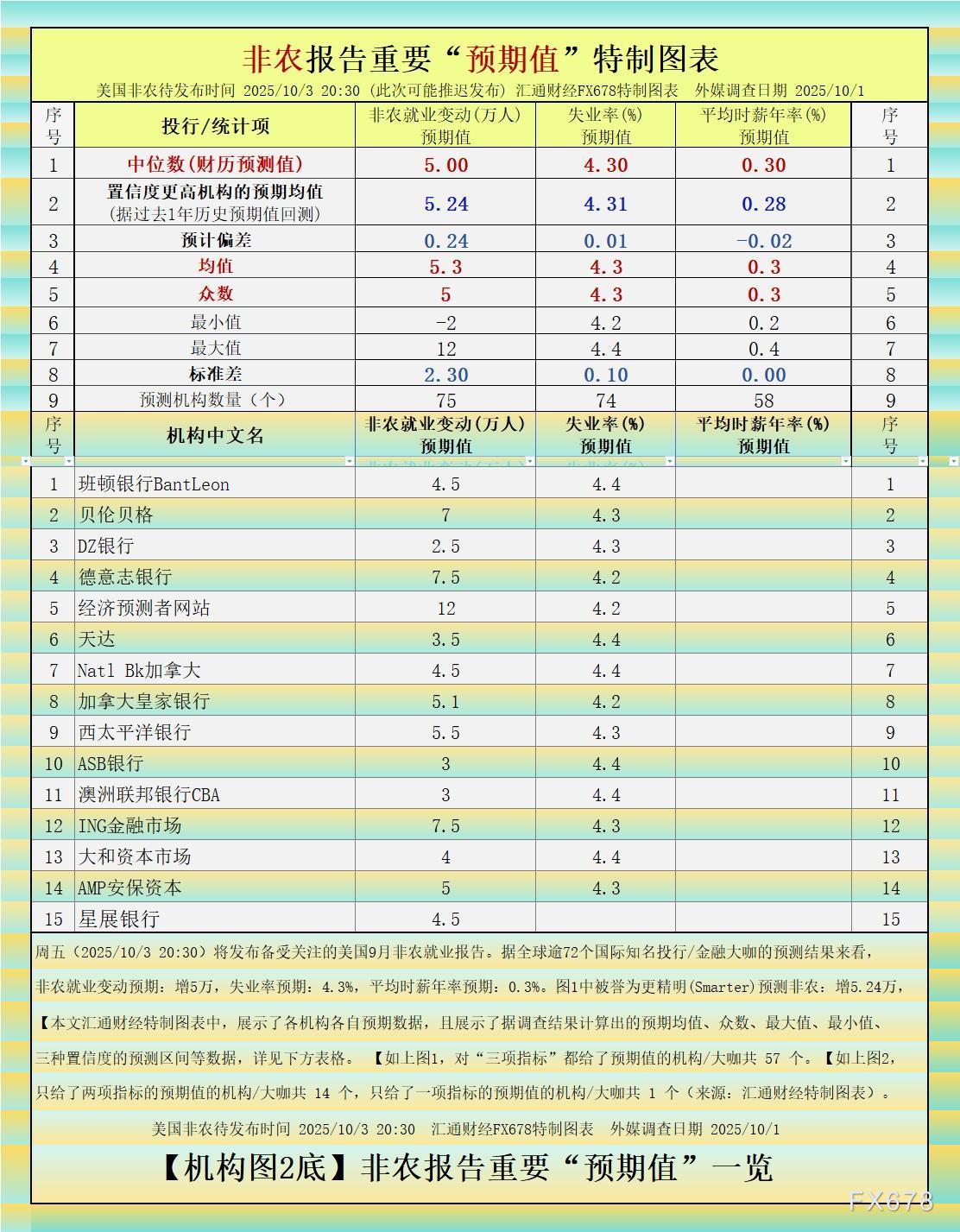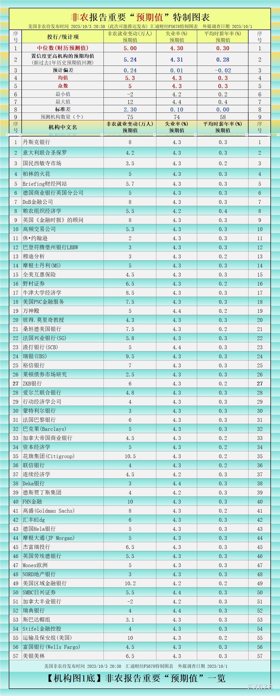 原定于周五(2025/10/3 20:30)发布美国9月非农就业报告,虽然很可能推迟发布,但全球投行/机构的预期值已准时出来了。据全球逾72个国际知名投行/金融大咖的预测结果来看,非农就业变动预期:增5万,失业率预期:4.3%,平均时薪年率预期:仅0.3%。若今晚推迟发布,持续跟进快讯内容查看最新动态。