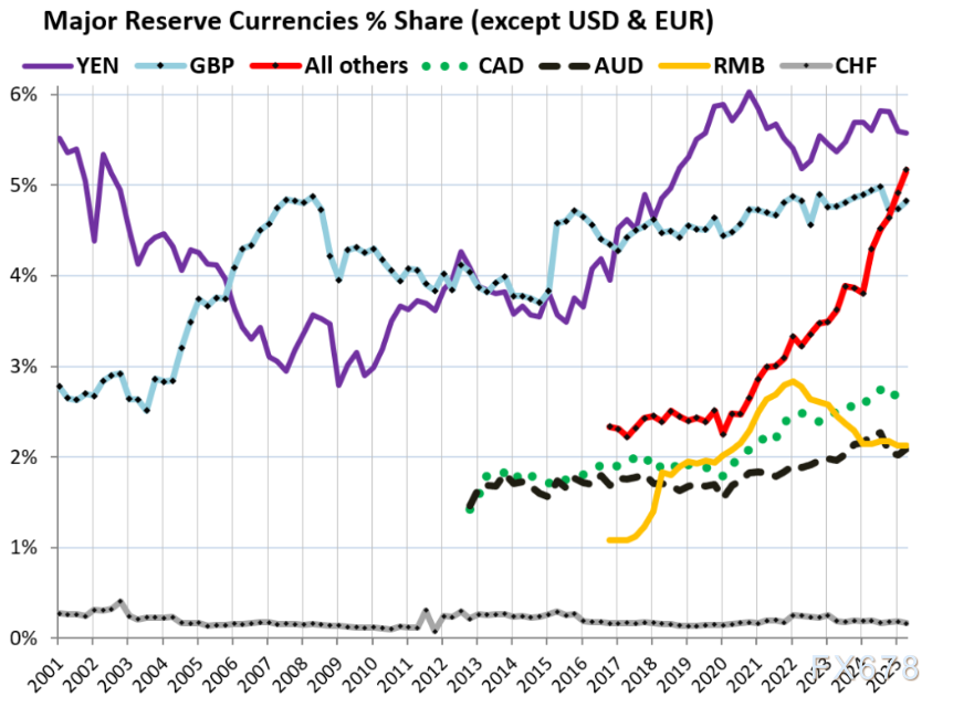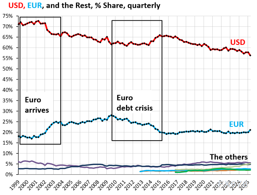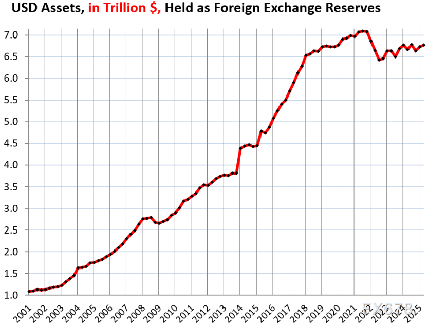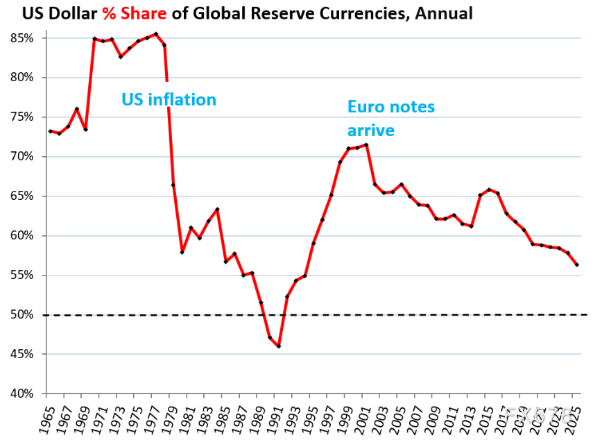IMF最新外汇储备报告揭示美元占比出现多年未有的变化,结合过往趋势推算未来或有新调整,其对相关经济体的深层影响,各国央行对美元资产的操作并非单一方向,背后推动储备结构变动的核心逻辑,与资产增速差异及配置策略调整存在关联。 ![]() 美元的全球主导储备货币地位再遇重挫。根据国际货币基金组织(IMF)最新发布的《官方外汇储备货币构成》报告,2025年第二季度,各国央行持有的美元计价资产占外汇储备总额的比例从上一季度的57.8%跌至56.3%,创下1994年以来的最低水平。 以过去五年的下滑节奏推算,未来五年美元占比或进一步降至50%。即便占比仅为50%,美元依旧是全球第一大储备货币——毕竟其他所有货币的占比总和也仅能与美元持平。但这一长期下行趋势已清晰可见,且将对美国产生深远的长期影响。 回溯历史,美元占比并非首次出现波动:1990年至1991年期间,其占比就曾低于50%(见下图虚线)。当时美元正处于一轮长期下跌周期的尾声——1977年其占比高达85%,但受20世纪70年代至80年代美国通胀失控影响,各国央行对美联储控通胀的决心丧失信心,最终导致1991年美元占比跌至46%。 后续美联储虽耗时数年,但终究控制住了通胀;到20世纪90年代,在欧元诞生前,各国央行再度开启美元资产增持周期(以下为各年末美元占比数据,2025年数据为第二季度数据)。 ![]() 2025年二季度美元占比大幅下滑:短期受汇率波动助推,长期趋势不受扰动 2025年第二季度美元汇率遭遇重挫,这一短期因素进一步拉低了美元占比。由于IMF在报告中统一以美元计量所有外汇储备,美元资产自然以美元计价,而欧元计价资产、其他货币计价资产则需按当期汇率折算为美元统计——汇率的大幅波动会改变非美元资产折算后的美元价值,但不会影响美元资产本身的价值,这就直接导致美元资产占比相对非美元资产占比发生变动。 具体来看,2025年第二季度美元对欧元汇率暴跌8.3%(见下图蓝色方框);作为全球第二大储备货币,欧元占比超20%,其汇率变动对美元占比具有关键性影响。由于欧元资产需按贬值后的美元汇率折算,折算后的美元价值随之上升,进而推动欧元在外汇储备总额中的占比提升至21.1%,美元占比则相应下滑。 不过,这一短期汇率因素并未改变美元的长期下行趋势。一方面,文章反驳市场流传的各类“美元崩盘论”,指出从长期视角看,此次汇率波动并无特殊性——历史上曾多次出现幅度更大、速度更快的汇率异动,且自欧元诞生以来,美元对欧元汇率始终处于历史区间中部;另一方面,IMF测算显示,若2025年第二季度美元汇率维持稳定,美元占比虽仍会延续下行趋势,但降幅将显著收窄。 从更长期维度看,美元指数(追踪美元对欧元区、日本、英国、加拿大、瑞典、瑞士六国货币的汇率)自1973年以来整体呈持平态势,尽管期间经历多轮大幅波动;另需关注的是,2009年至2022年美元曾开启一轮大幅升值周期,而近期的美元贬值仅回吐了当时升值幅度的一小部分,进一步说明短期汇率波动不会扭转长期趋势。 ![]() 储备货币格局新变:非传统货币崛起分流份额 当前全球储备货币格局呈现显著新趋势:一方面,IMF定义的“非传统储备货币”(涵盖数十种小币种)占比大幅攀升——若仔细观察外汇储备结构图表底部交织的彩色线条(下文将展开分析),可发现这类货币的占比增长明显,各国央行正持续加大对其计价资产的增持力度; ![]() 这一格局变化进一步分流了美元的储备份额:“非传统储备货币”占比的上升,主要挤压了美元与人民币的份额。 2025年第二季度,各国央行持有的美元及其他货币计价外汇储备(以美元计)规模升至12.9万亿美元,其中主要储备货币资产规模(按美元计价)为:美元计价资产6.77万亿美元、欧元计价资产2.54万亿美元、日元计价资产0.67万亿美元、英镑计价资产0.58万亿美元、加拿大元计价资产0.31万亿美元。多年来,非传统货币的合计占比持续上升,其份额正是从美元处获得; 而自2015年起,欧元占比基本维持稳定,进一步说明美元份额的流失主要流向了非传统货币。显然,全球各国央行正通过这一储备结构调整,进一步减少对美元的依赖。 ![]() 美元占比下滑非因持续抛售,核心驱动是储备多元化与非美元资产增速领先 各国央行并未对美元计价证券采取持续抛售动作。不过需注意特殊阶段的调整:2022年美国通胀再度爆发时,各国央行曾连续三个季度抛售美元计价证券,2022年第一、二、三季度累计抛售规模达6600亿美元。 但当美联储严肃应对通胀——启动加息并开启缩表(QT)后,抛售行为随即停止,各国央行重新进入美元资产增持周期。2025年第二季度,其持有的美元资产规模增至6.77万亿美元,只是这一规模仍低于2021年第四季度7.09万亿美元的峰值水平。 显然,各国央行正通过多元化配置策略,逐步降低对美元的依赖度。美元计价外汇储备的涵盖范围包括美国国债、美国抵押贷款支持证券(MBS)、美国机构证券、美国公司债券,以及除美联储外其他各国央行持有的各类美元计价资产;需特别说明的是,各国央行持有的本币计价资产(如美联储持有的美国国债、欧洲央行持有的欧元计价债券)不纳入统计,避免数据干扰。 ![]() 事实上,多年来美元资产占比下滑的核心原因,并非“持续抛售”,而是全球外汇储备总额的扩张逻辑发生变化:这一扩张由其他货币(含多种小币种)计价资产的增速主导,且该增